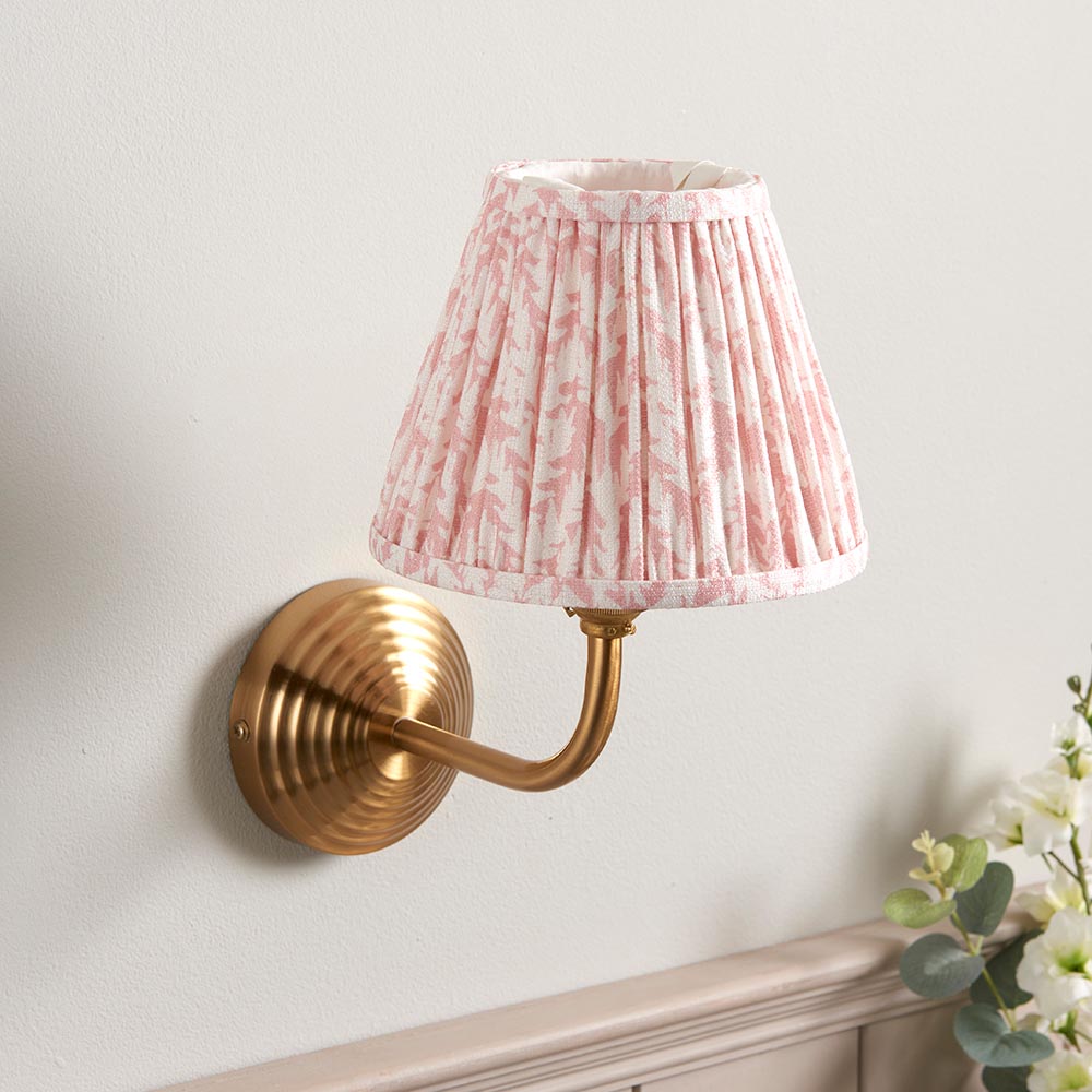 A multiple stepped wall light with a simple curve arm, finished in brushed aged brass. This look is completed with our subtle peachy keen 16cm Leaf shade.