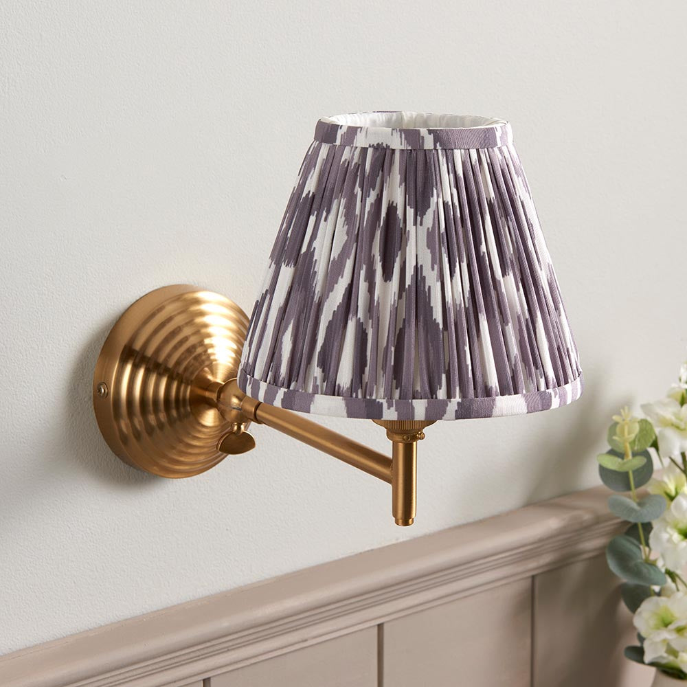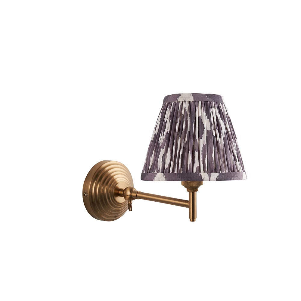 A multiple stepped wall light with a simple linear arm, featuring an adjustable knuckle to fold and reposition the wall light. Perfect for bedsides, finished in brushed aged brass, completed with our stylish pearl grey 16cm Ikat shade.
