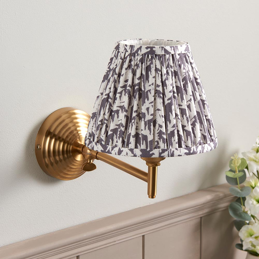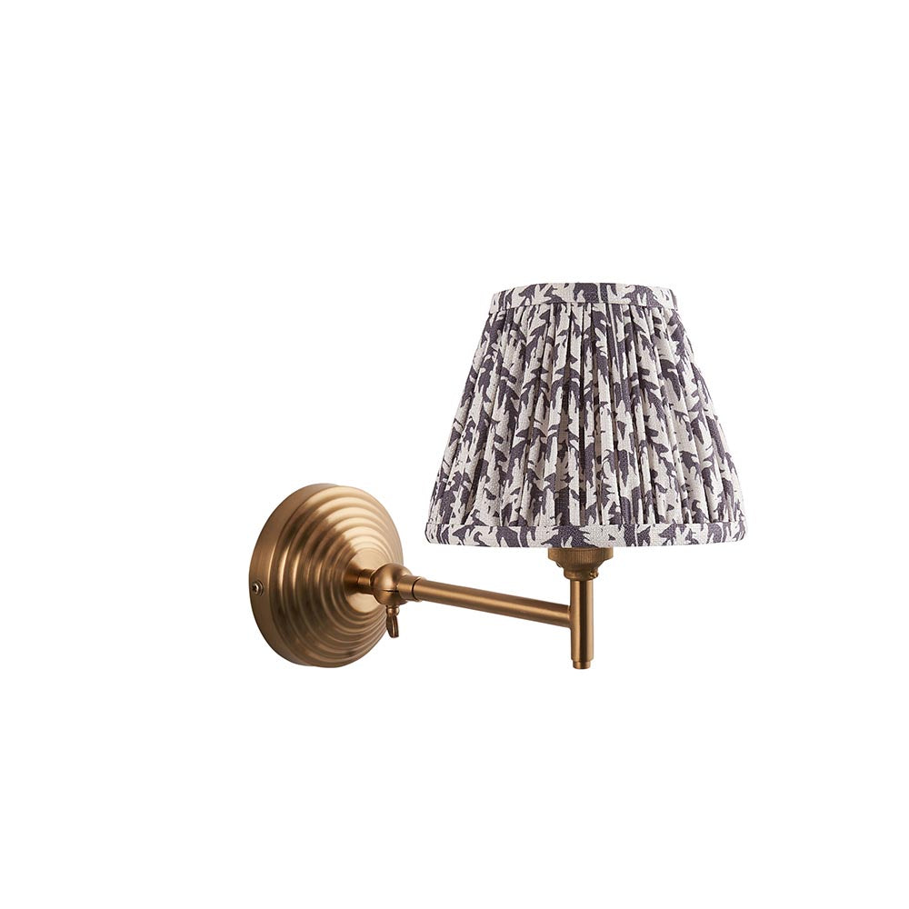 A multiple stepped wall light with a simple linear arm, featuring an adjustable knuckle to fold and reposition the wall light. Perfect for bedsides, finished in brushed aged brass, completed with our subtle pearl grey 16cm Leaf shade.