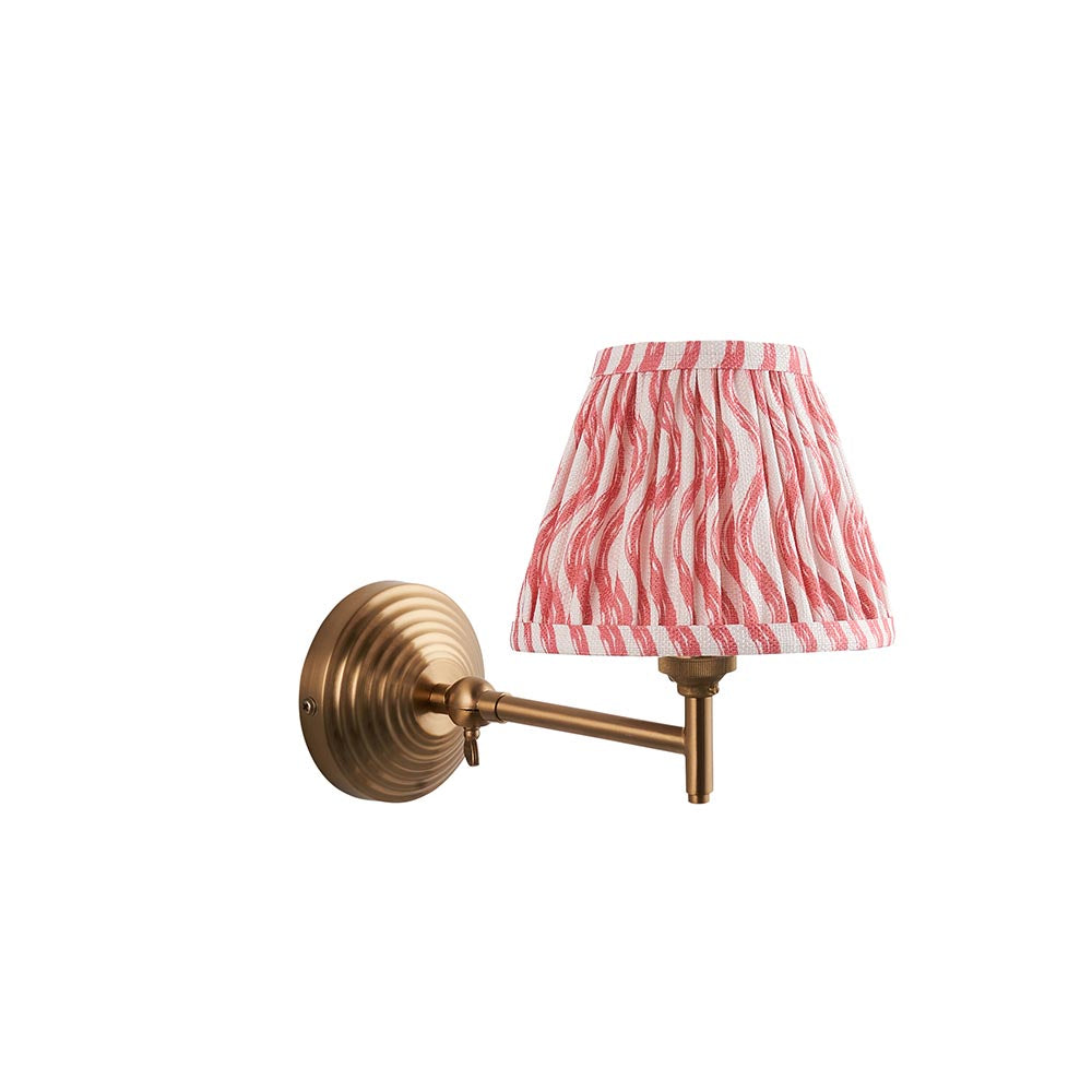 A multiple stepped wall light with a simple linear arm, featuring an adjustable knuckle to fold and reposition the wall light. Perfect for bedsides, finished in brushed aged brass, completed with our bright coral pink 16cm Ripple shade.