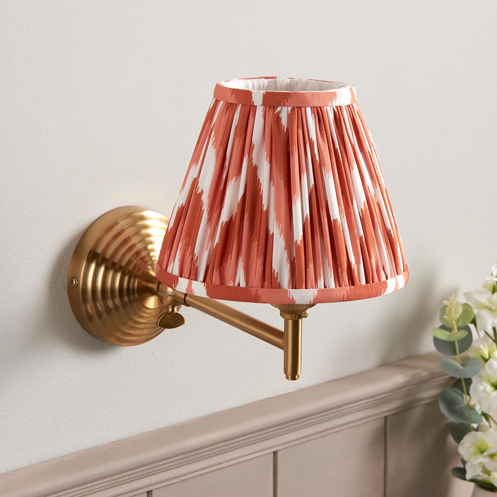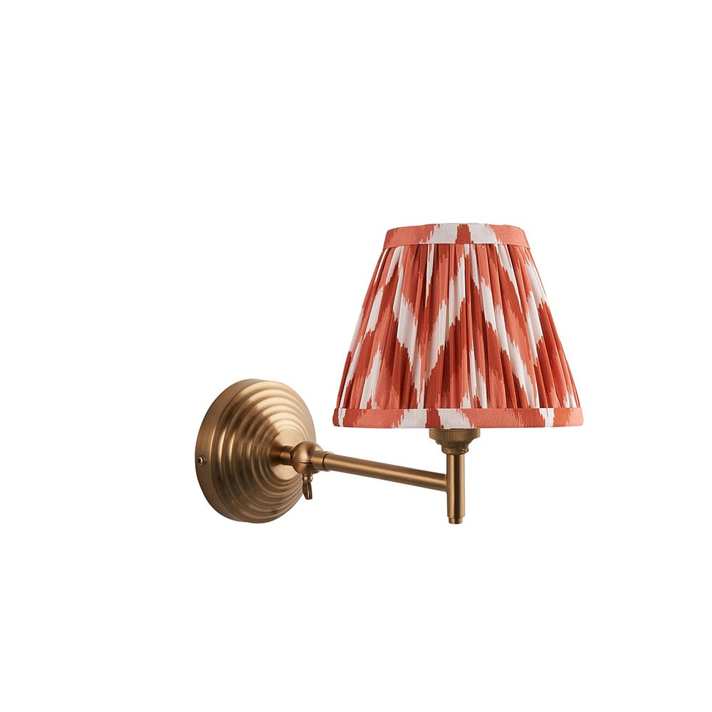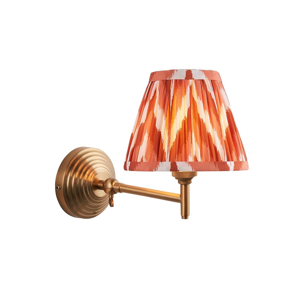 A multiple stepped wall light with a simple linear arm, featuring an adjustable knuckle to fold and reposition the wall light. Perfect for bedsides, finished in brushed aged brass, completed with our bright apricot orange 16cm Zigzag shade.