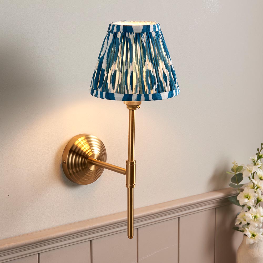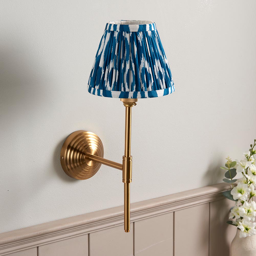A multiple stepped wall light with an understated T shape arm. Perfect for many areas of your home, finished in brushed aged brass. Paired with our vibrant marlin blue 16cm Ikat shade for a classic look.