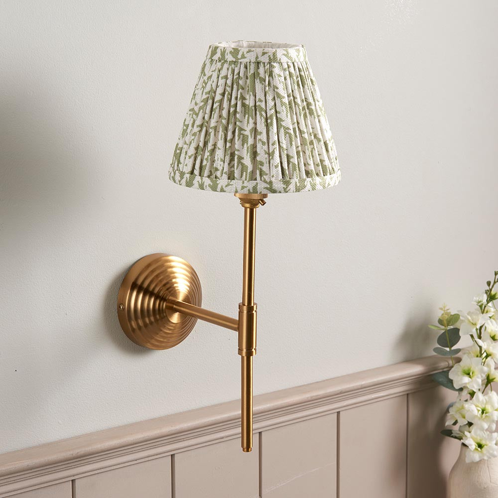 A multiple stepped wall light with an understated T shape arm. Perfect for many areas of your home, finished in brushed aged brass. Paired with our subtle herb green 16cm Leaf shade for a classic look.