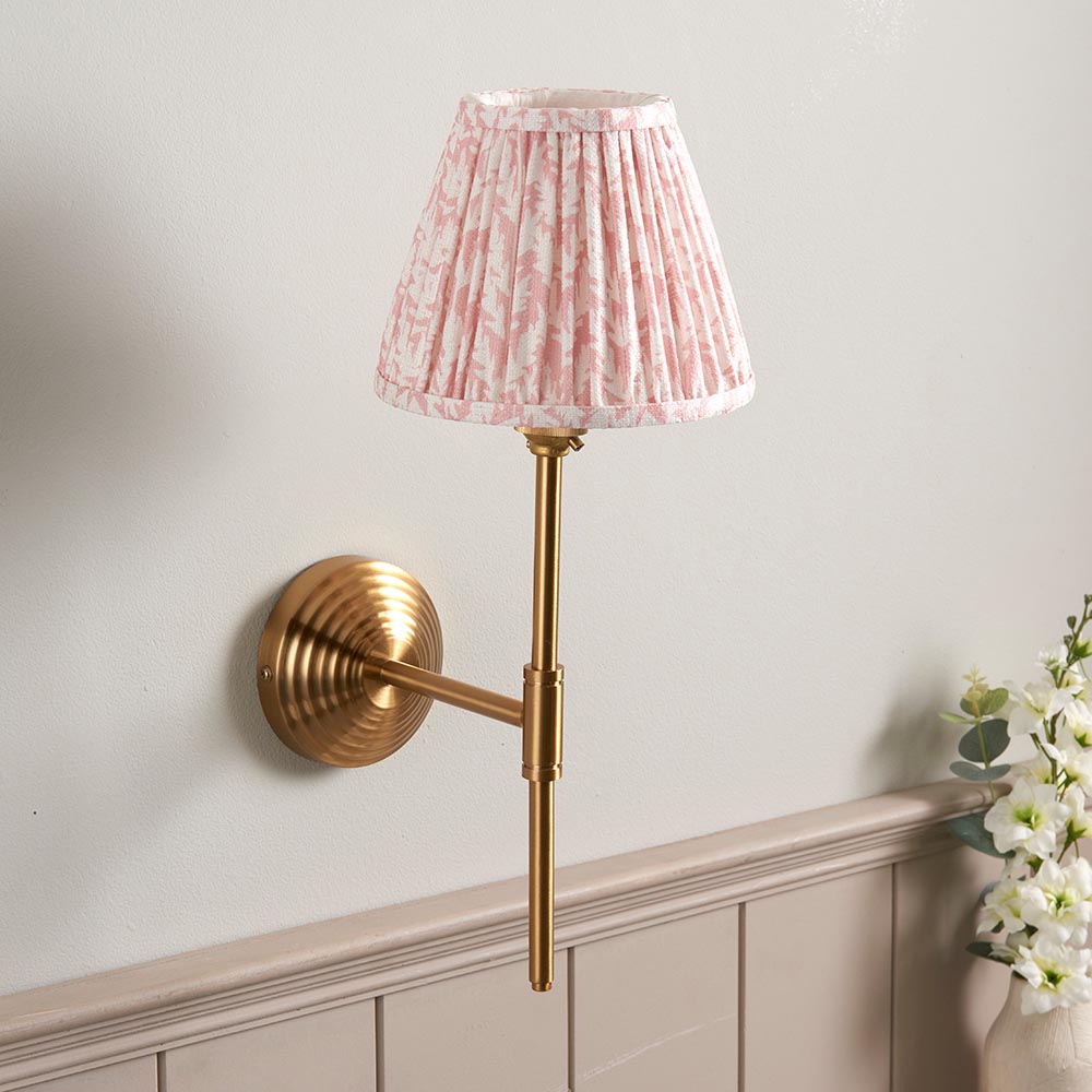 A multiple stepped wall light with an understated T shape arm. Perfect for many areas of your home, finished in brushed aged brass. Paired with our subtle peachy keen 16cm Leaf shade for a classic look.