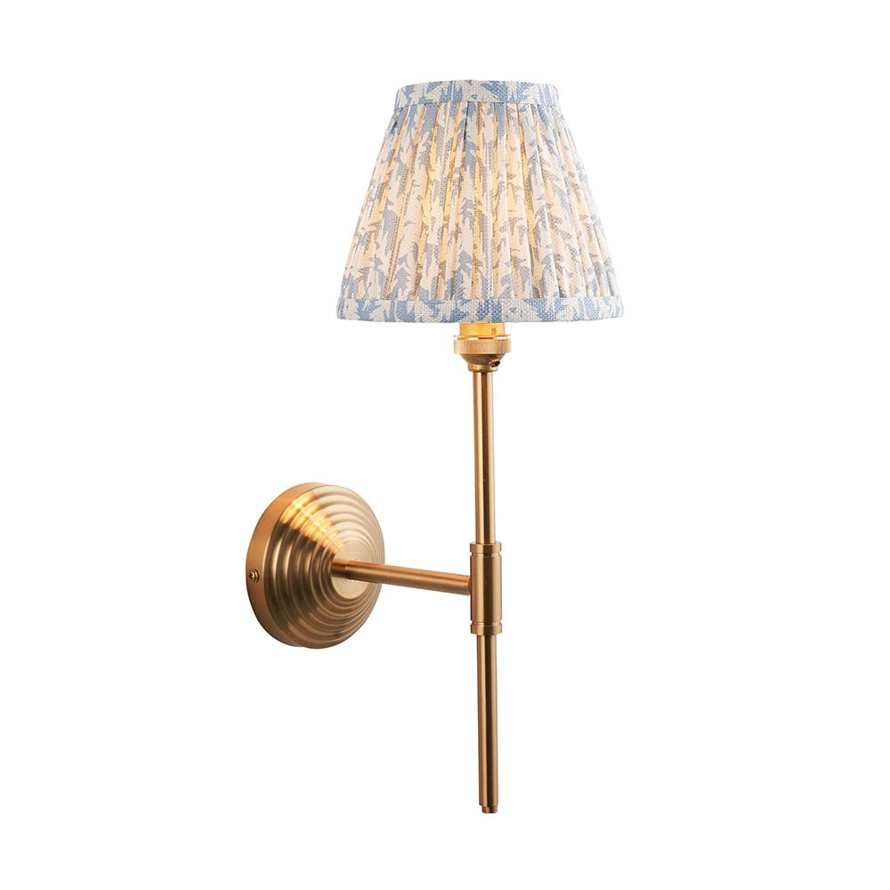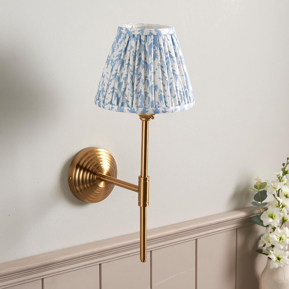 A multiple stepped wall light with an understated T shape arm. Perfect for many areas of your home, finished in brushed aged brass. Paired with our subtle shell bay blue 16cm Leaf shade for a classic look.