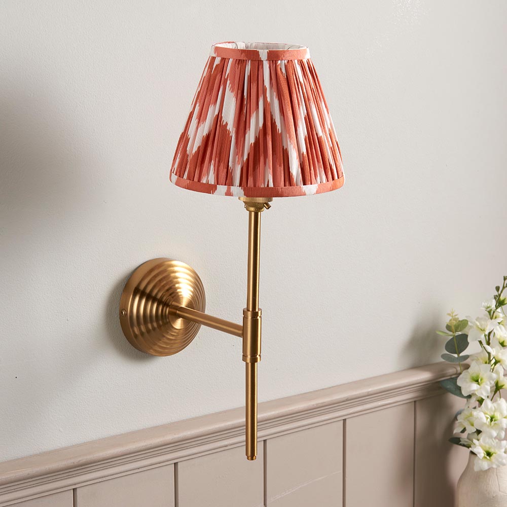 A multiple stepped wall light with an understated T shape arm. Perfect for many areas of your home, finished in brushed aged brass. Paired with our bright apricot orange 16cm Zigzag shade for a classic look.