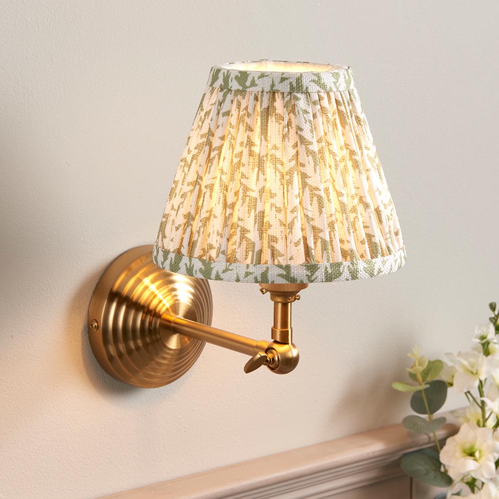 A multiple stepped wall light with a simple linear arm featuring an adjustable knuckle to angle the wall light for that authentic classic look. Perfect for bedsides, hallways and lounge spaces. Finished in brushed aged brass and completed with our subtle herb green 16cm Leaf shade.