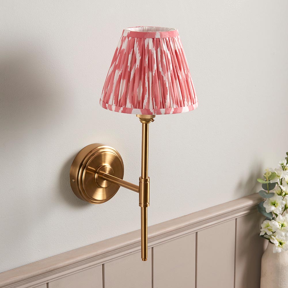 A classic stepped wall light with understated T shape arm. Perfect for many areas of your home, finished in brushed aged brass; paired with our vibrant coral pink 16cm Ikat shade.
