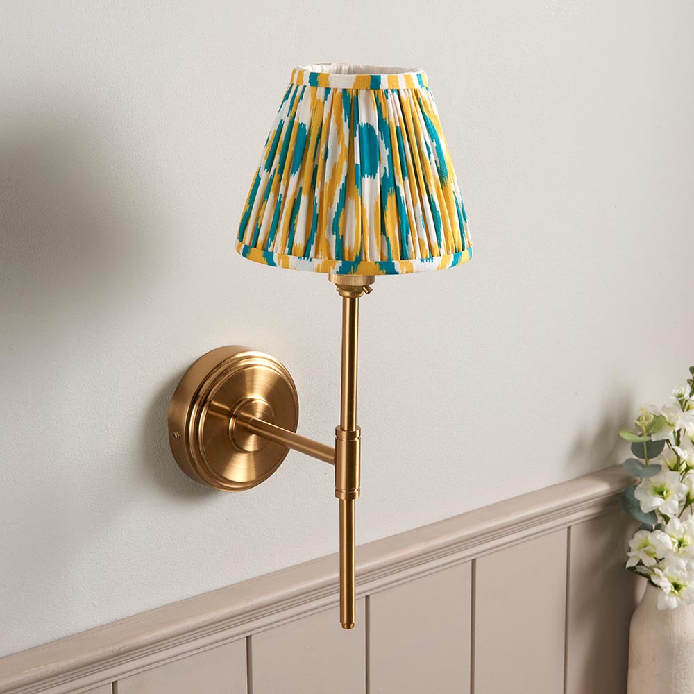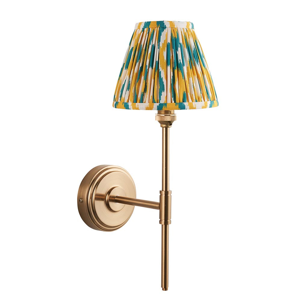 A classic stepped wall light with understated T shape arm. Perfect for many areas of your home, finished in brushed aged brass; paired with our vibrant yellow & jade 16cm Ikat shade.