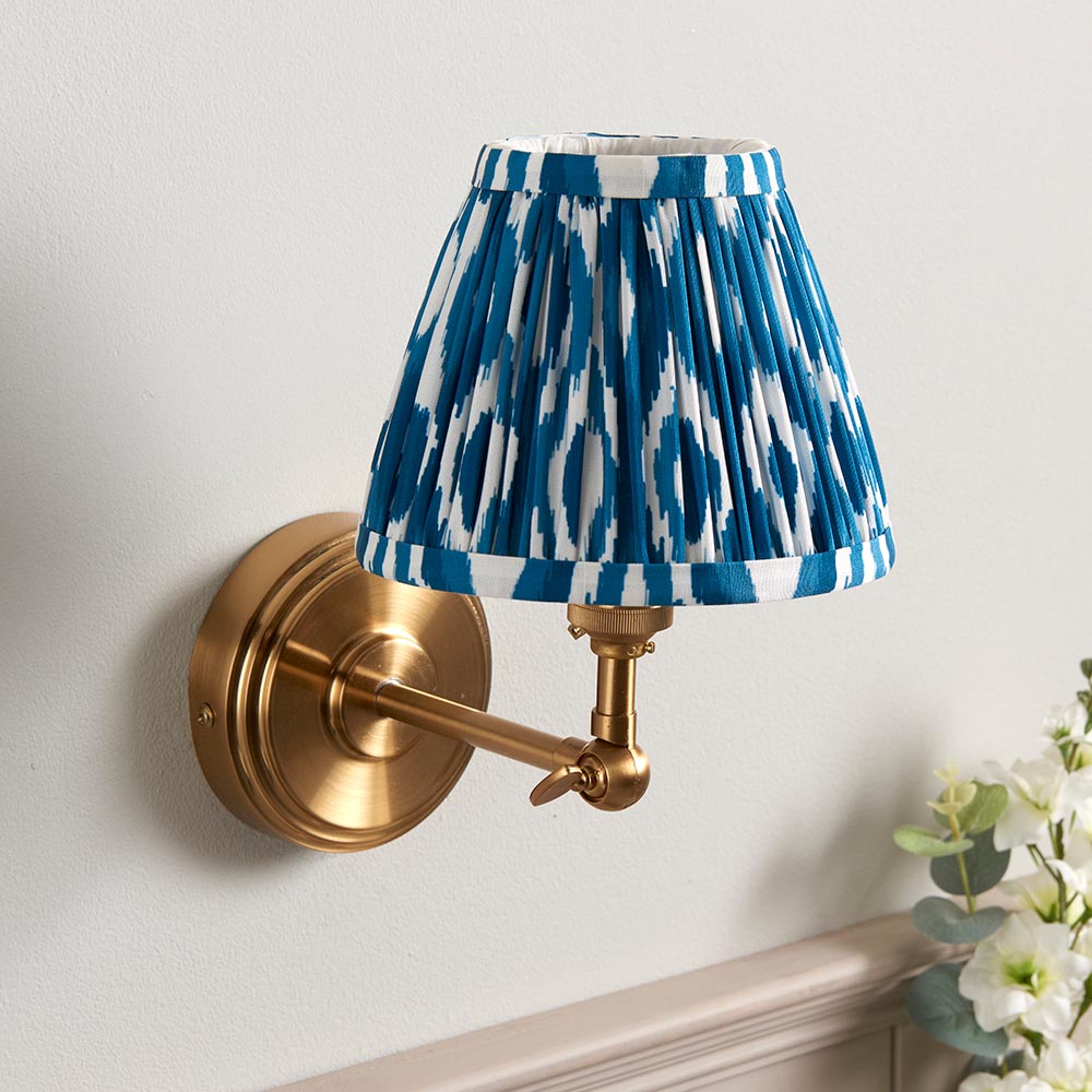 A classic stepped wall light with simple linear arm, featuring an adjustable knuckle to angle the wall light for that authentic classic look. Perfect for bedsides, hallways and lounge spaces. Finished in brushed aged brass, complete with our vibrant marlin blue 16cm Ikat shade.