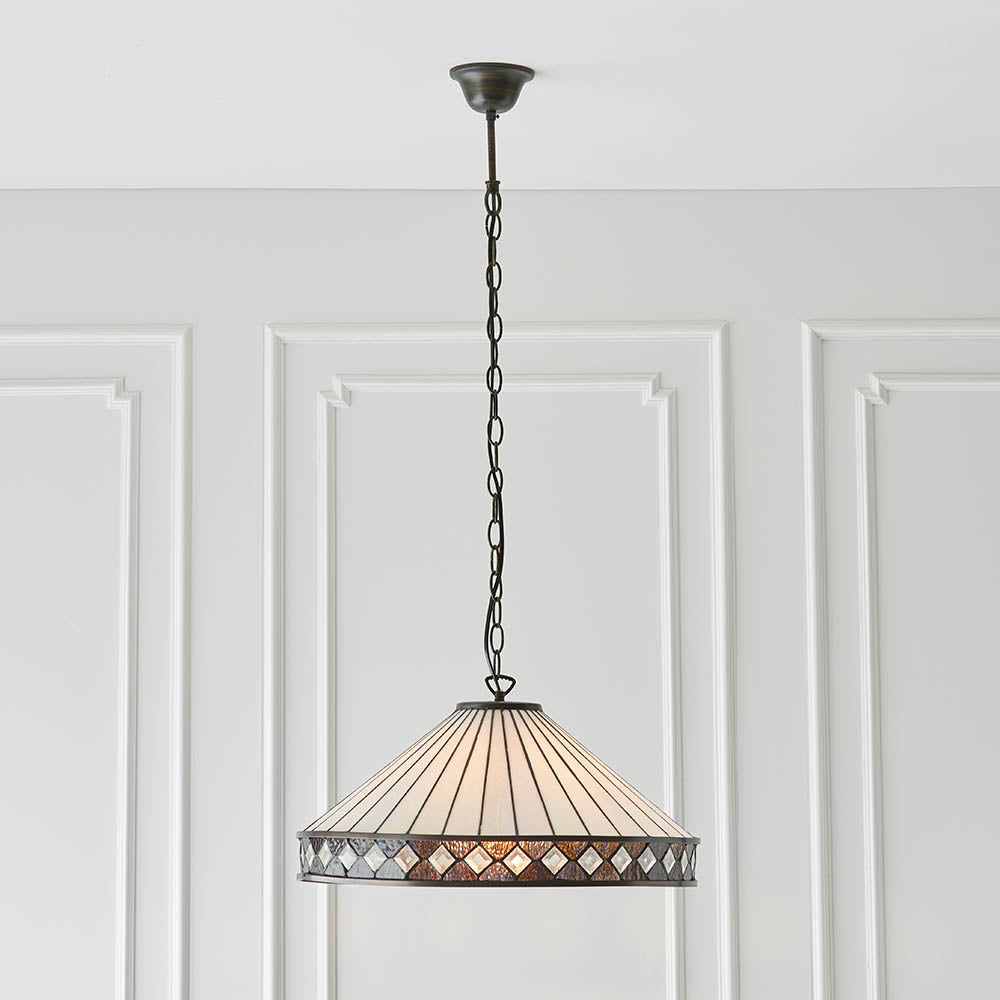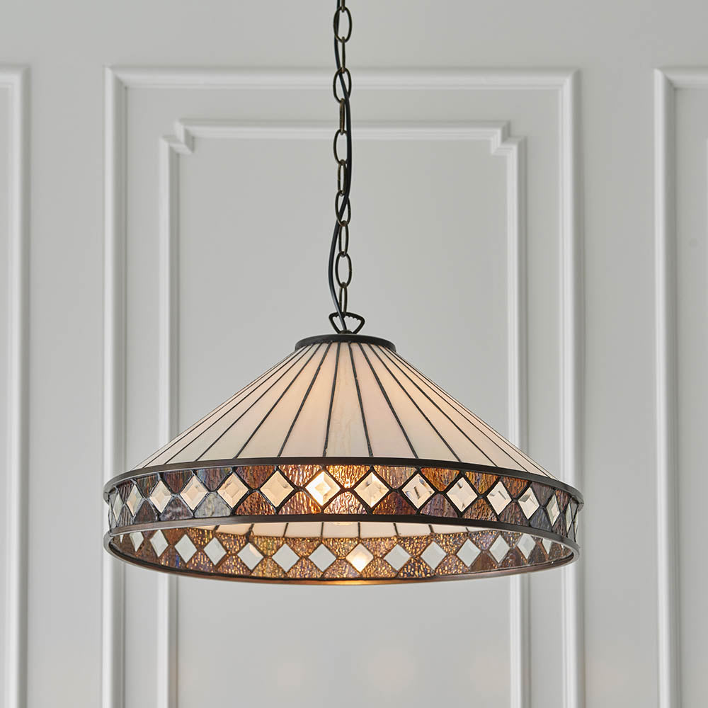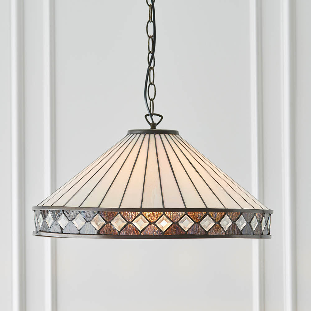 This Tiffany style pendant is a beautifully understated design comprising of clean lines with a diamond shaped border. Teamed with a satin black fitting, dimmable and compatible with LED lamps. Matching items available for a coordinated look