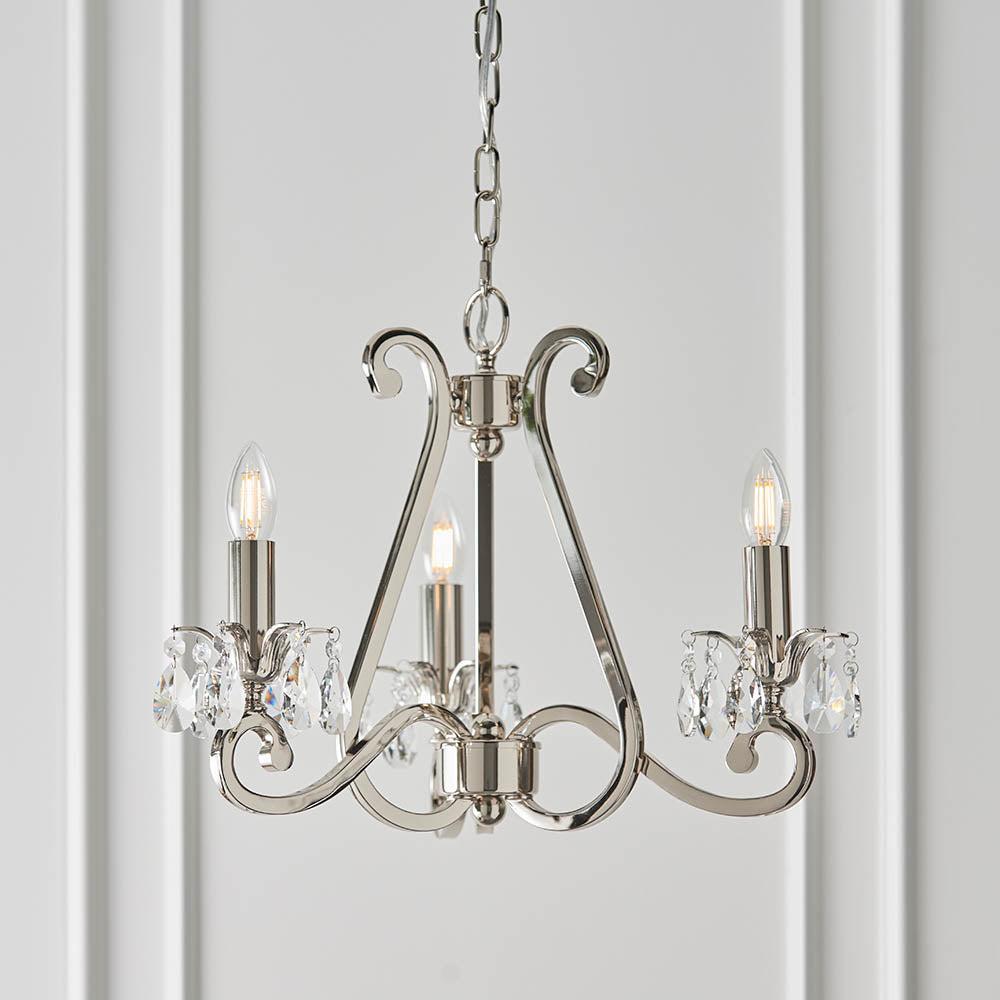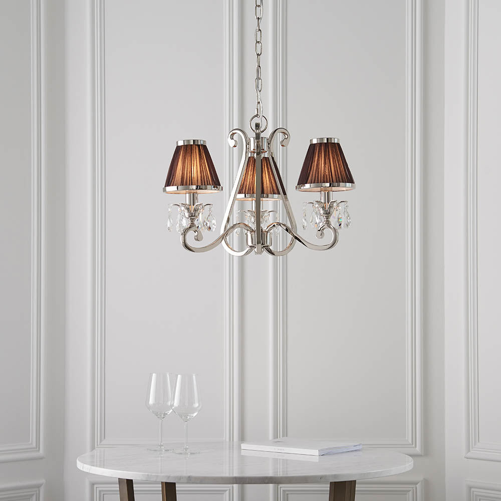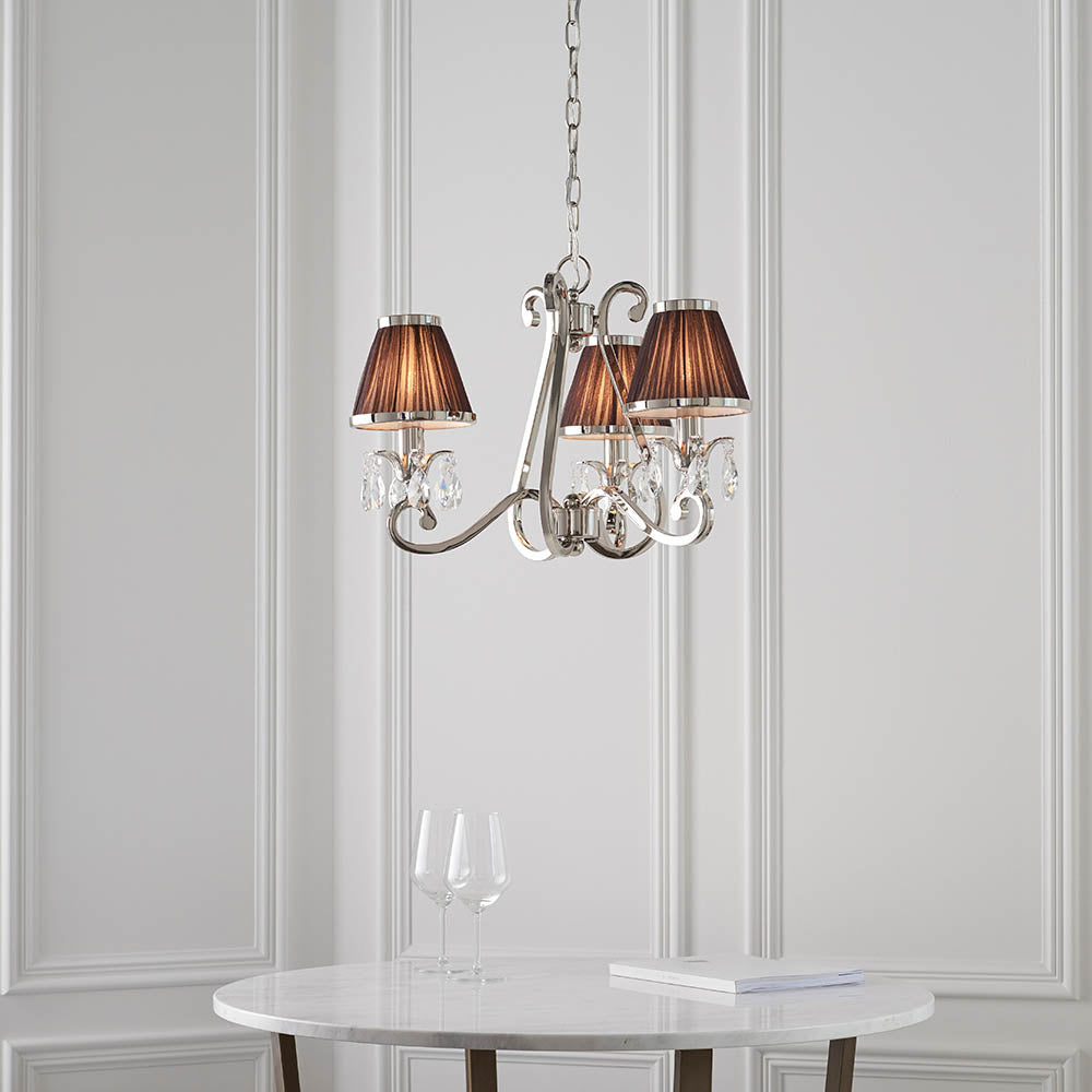 A 3 light pendant from the Oksana nickel range. Features faceted lead crystal droplets and chocolate pleated shades with a polished nickel trim. Matching items available and compatible with LED lamps