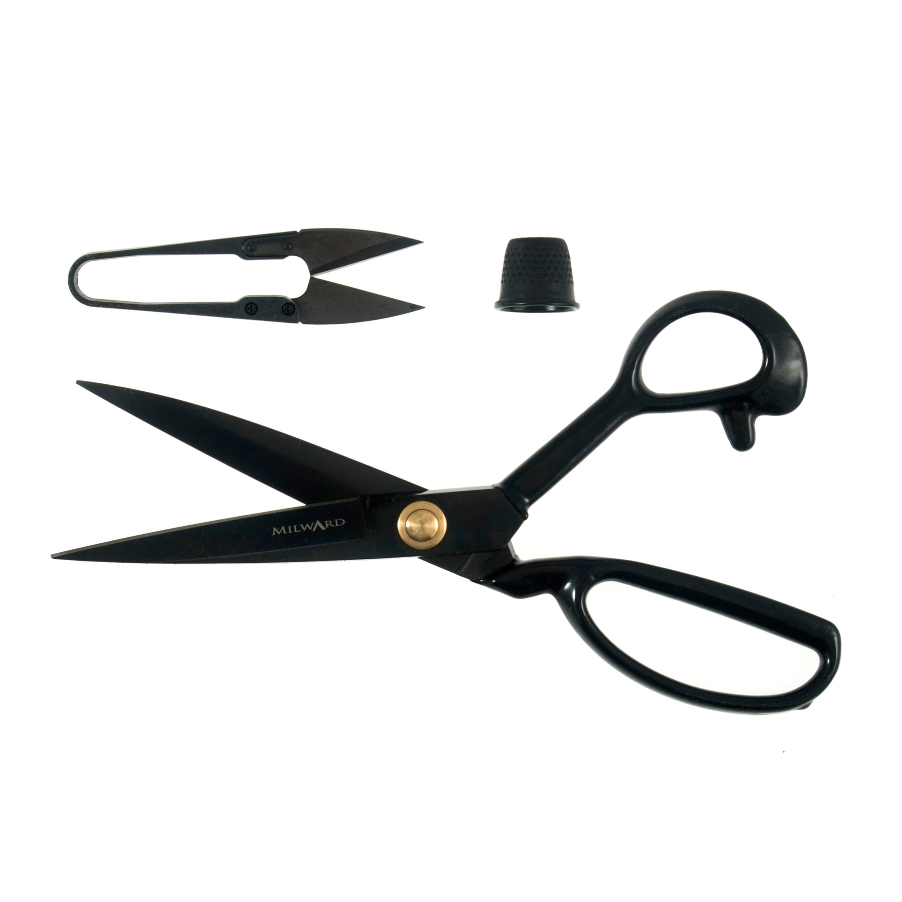 - Large heavy duty tailors shears with thread snips and thimble in a stunning black finish.