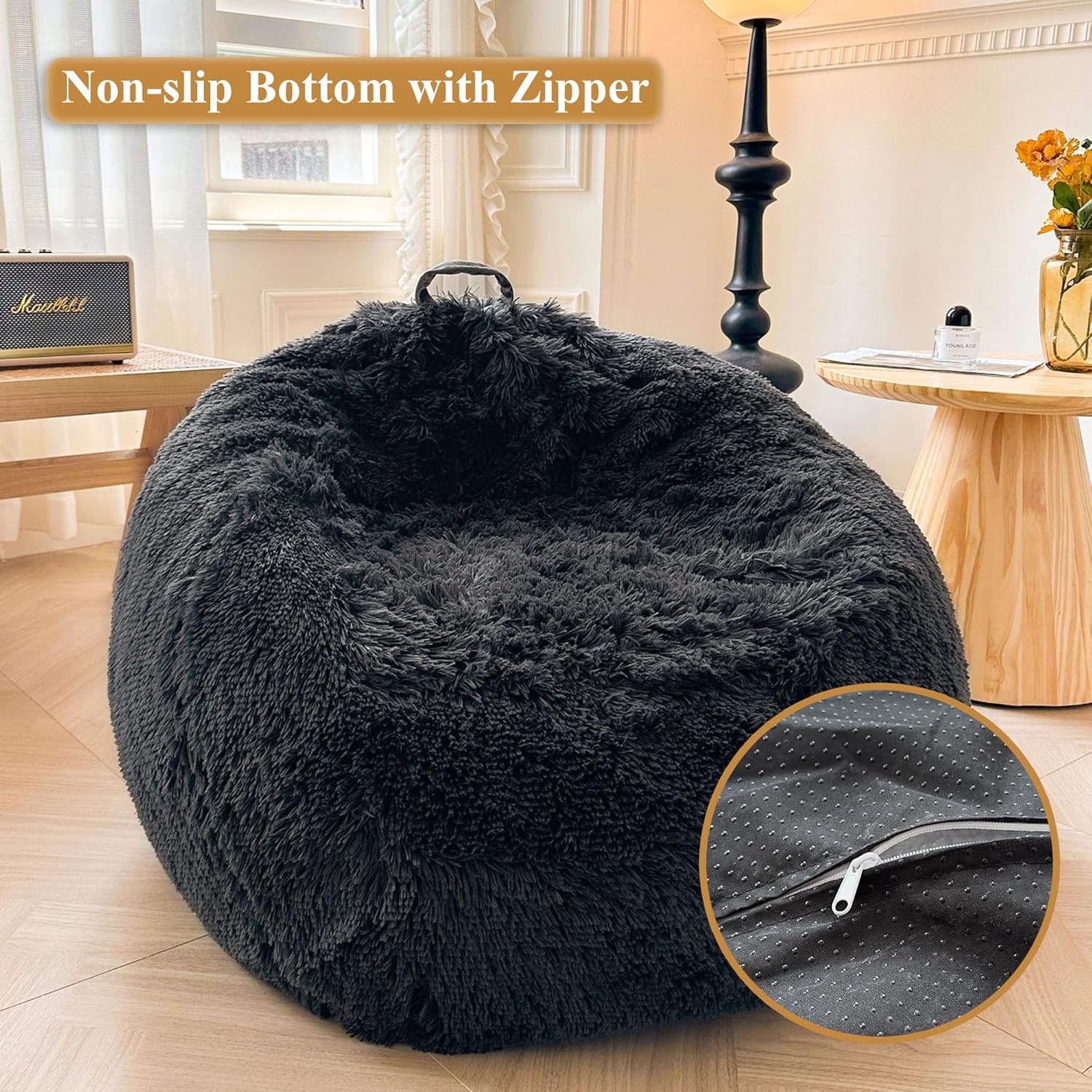 Size: 38"x38"x40"/96x96x101CM, perfect for both kids and adults, filled with up to 300L of high quality polystyrene beads. The hidden zipper prevents children from getting injured and protects your floor, while the non-slip bottom ensures the bean bag stays securely in place.