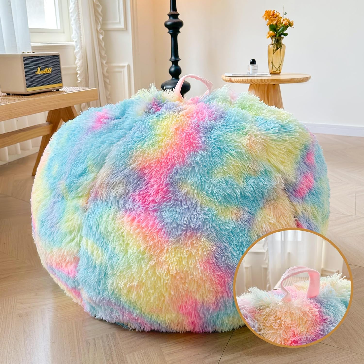 Versatile: Whether you're reading, watching TV, sleeping, or playing with kids, this shaggy bean bag is perfect. Additionally, it's easy to take with you wherever you go. Featuring a convenient built-in handle at the top, you can effortlessly carry it to the bedroom, living room, kids' playroom, nursery, dorm, balcony, and more. Plus, it's an ideal spot for your furry friends too.