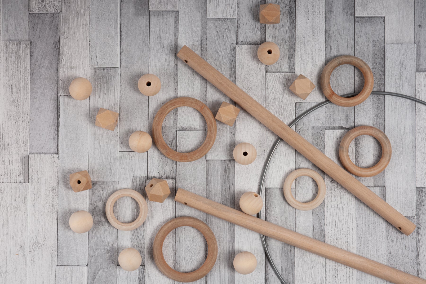 • Kit includes: 2 x wooden dowels (30cm x 12mm); 2 x 7cm wooden rings; 2 x 5.5.cm wooden rings; 2 x 4.5cm wooden rings; 1 x 25cm metal hoop; 10 x 20mm wooden geometric beads; 20 x 25mm wooden round beads.