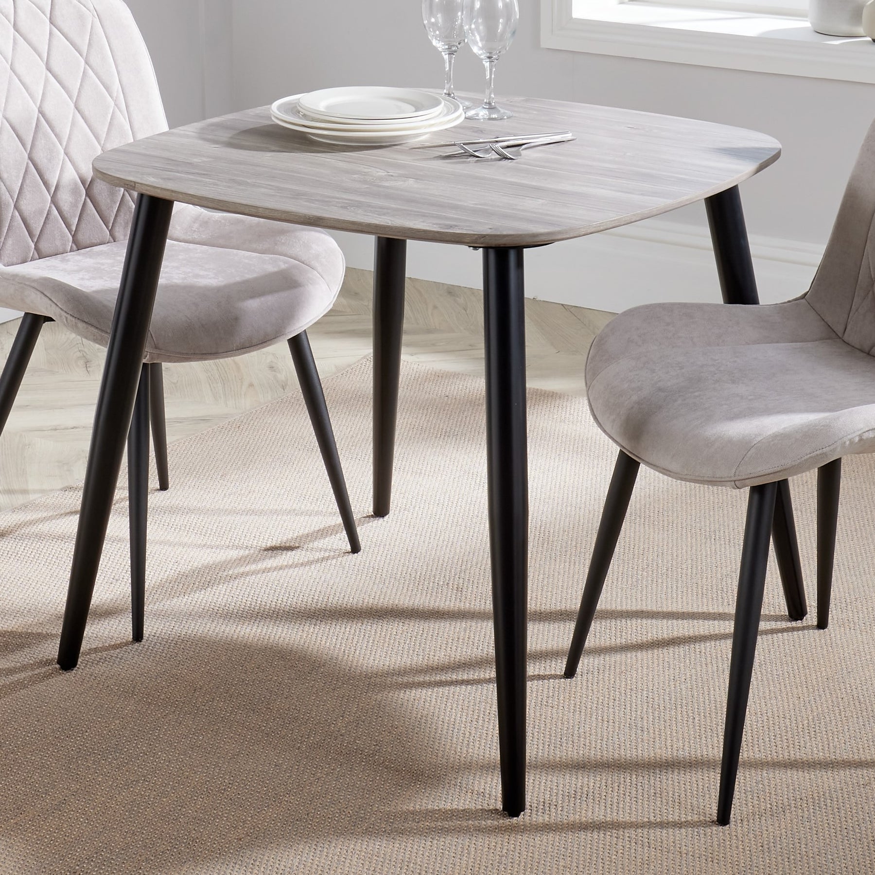 Our compact square dining table features soft rounded corners and tapered edge design with an easy to clean grey oak textured effect finish. Each leg is precision manufactured from tapered tubular steel with a black matt paint and built in adjusters for uneven floors. W80 x D80 x H75 cm