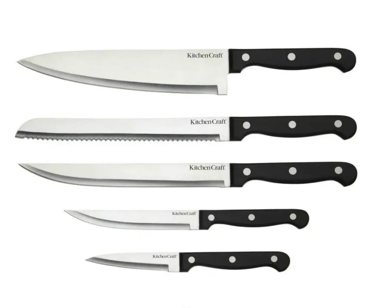 Whether you're flying the family nest for the first time, getting to grips with the culinary code or looking to replace your tired old tools, KitchenCraft's six piece knife and storage block set has all the essential cutting tools you need to get started! This set includes a collection of high-quality kitchen knives – a chef's knife, bread knife, paring knife, utility knife and carving knife. It also includes a pair of scissors with a built-in jar opener. Each tool features durable stainless steel blades, making them ideal for a variety of daily kitchen jobs. The knives also feature full-length tangs and triple-riveted handles, so you can rest assured - they're built to last. You get a stylish wooden knife block to safely store them away in too. Crafted from rubberwood, it's sure to stand out nicely on your kitchen's worktop! Key Features: Knives are dishwasher safe. Block is wipe clean only. Not to be sold to persons under the age of 18
