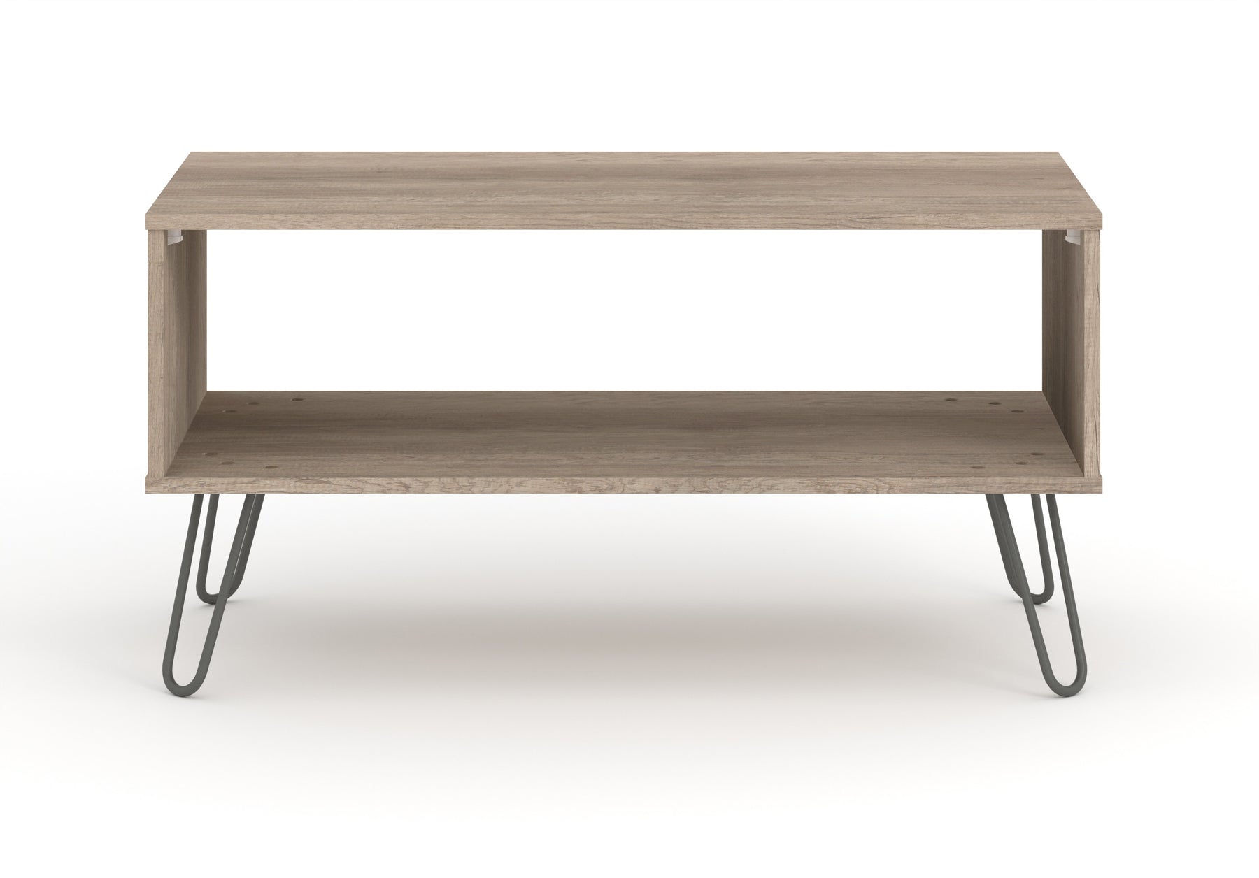 A great centre piece, this industrial look coffee table has useful undershelf storage in an easy to clean driftwood effect melamine finish with plastic pull handles and metal feet. W91 x D45 x H46.6 cm