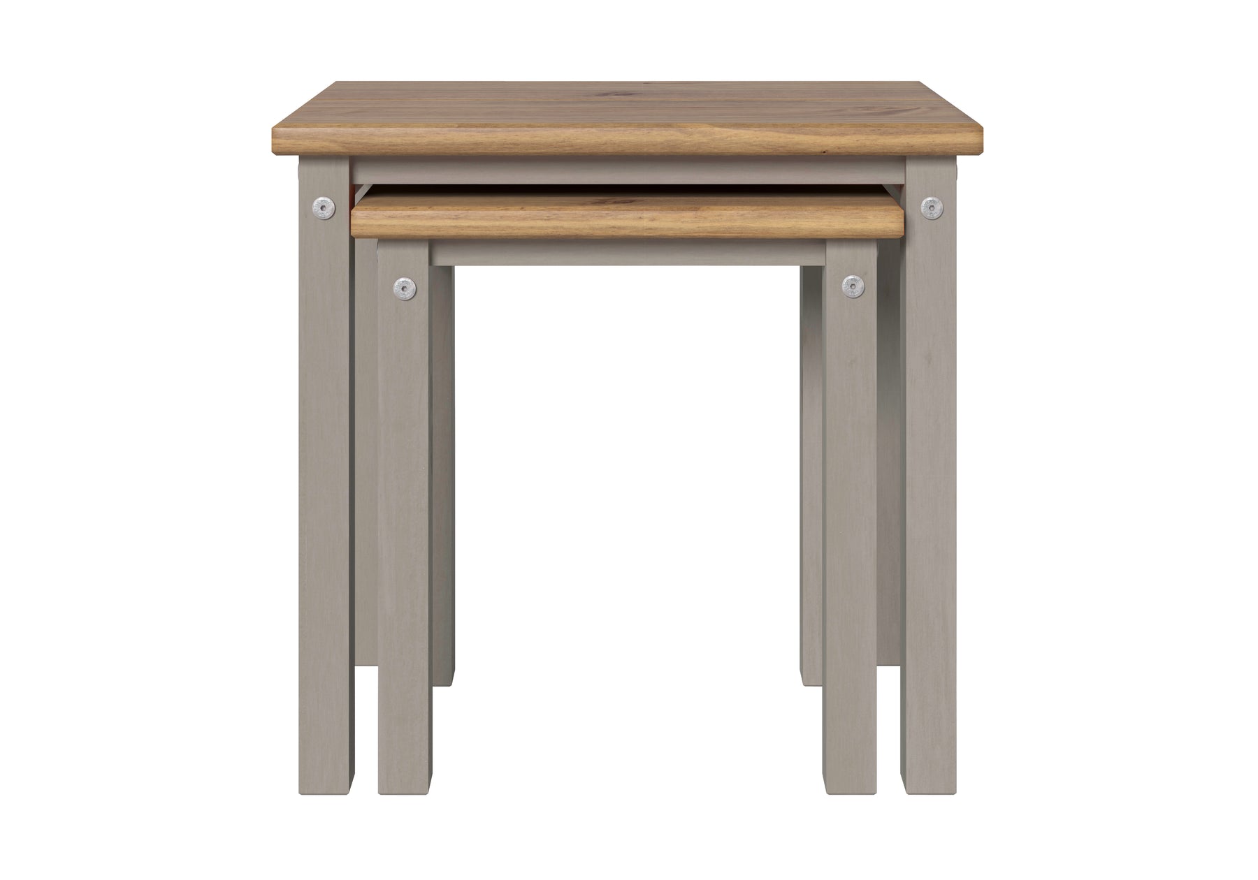 Useful set of 2 tables which can be used independently or nested to save space. Featuring in a grey waxed finish underframe with antique waxed pine tops with plank effect. W53 x D35 x H51.1 cm