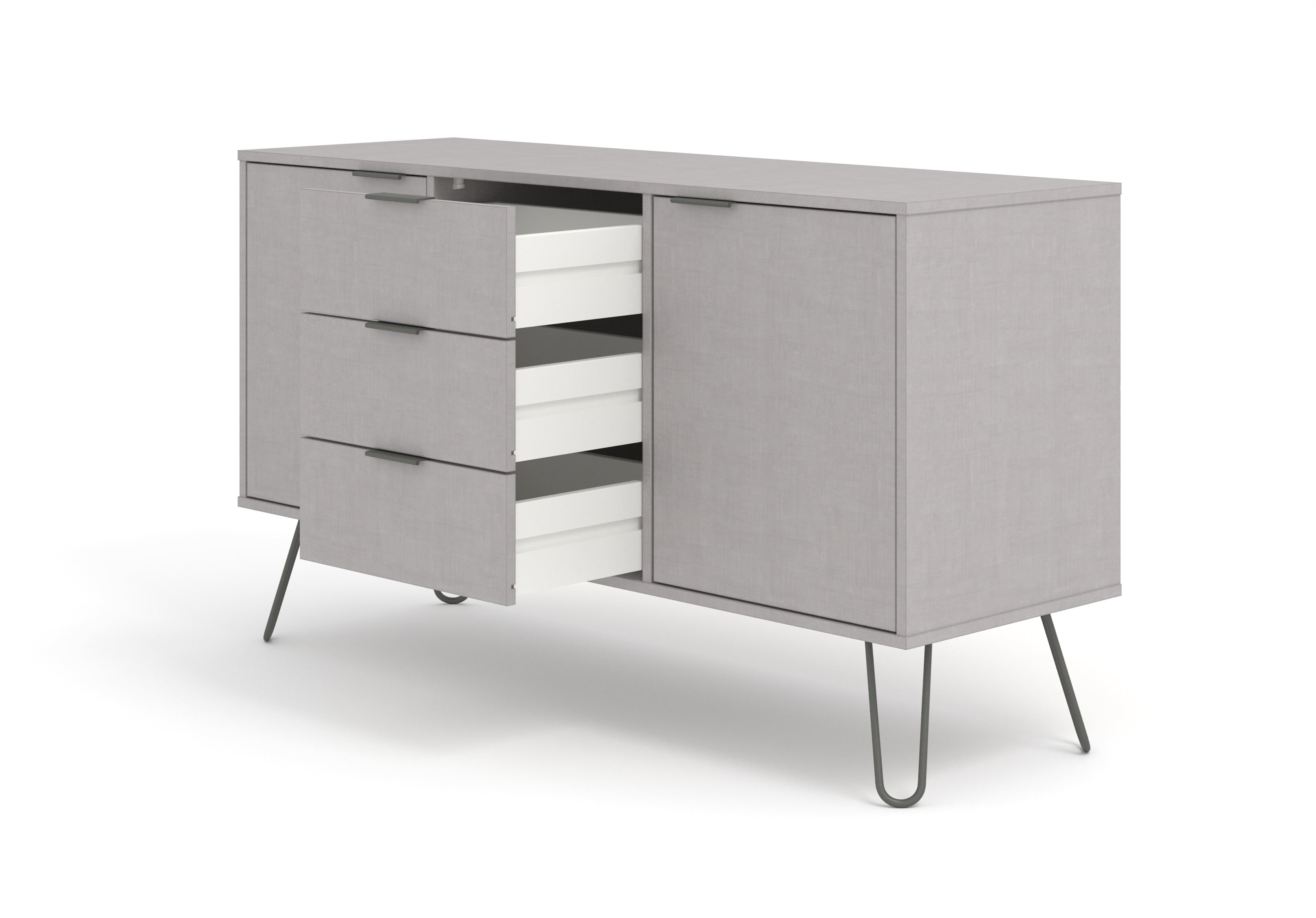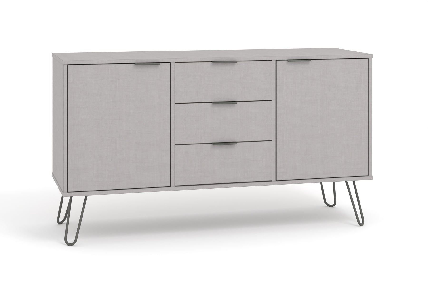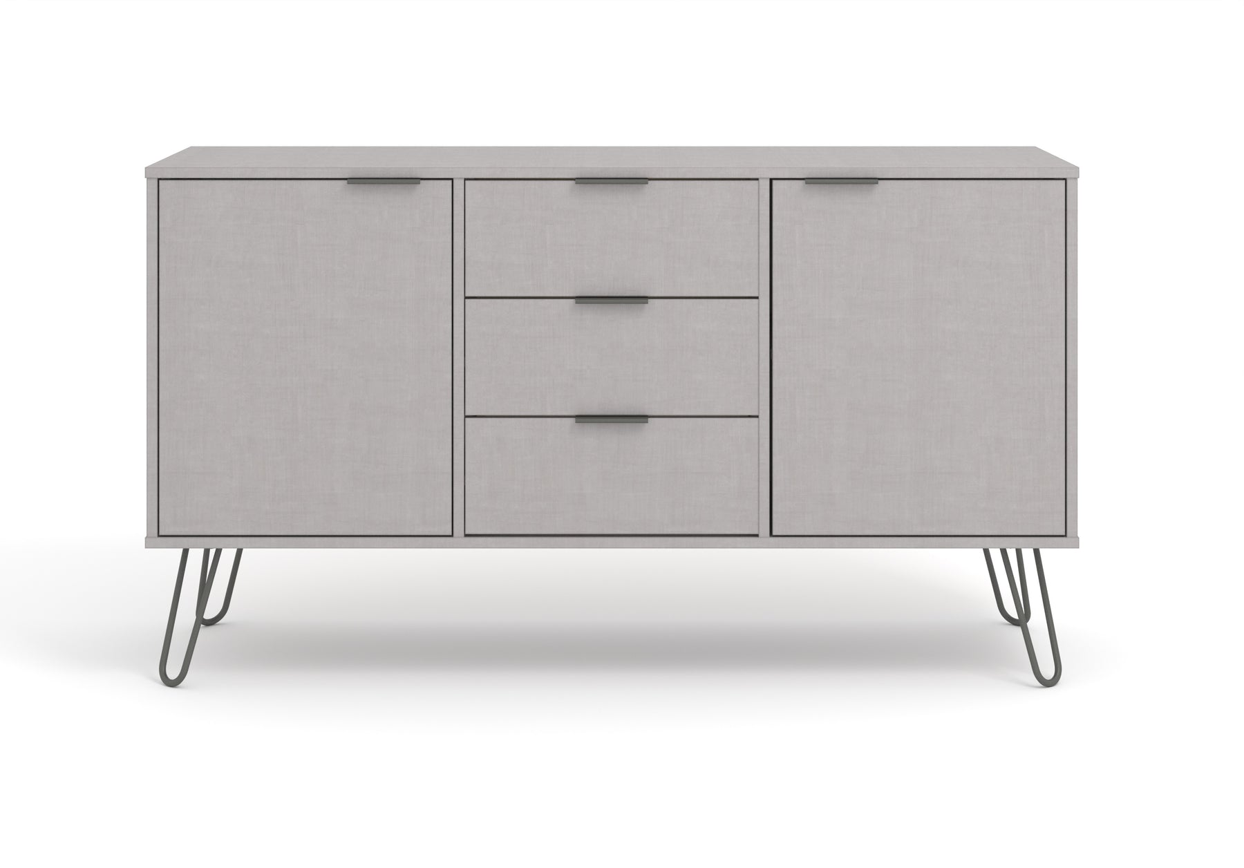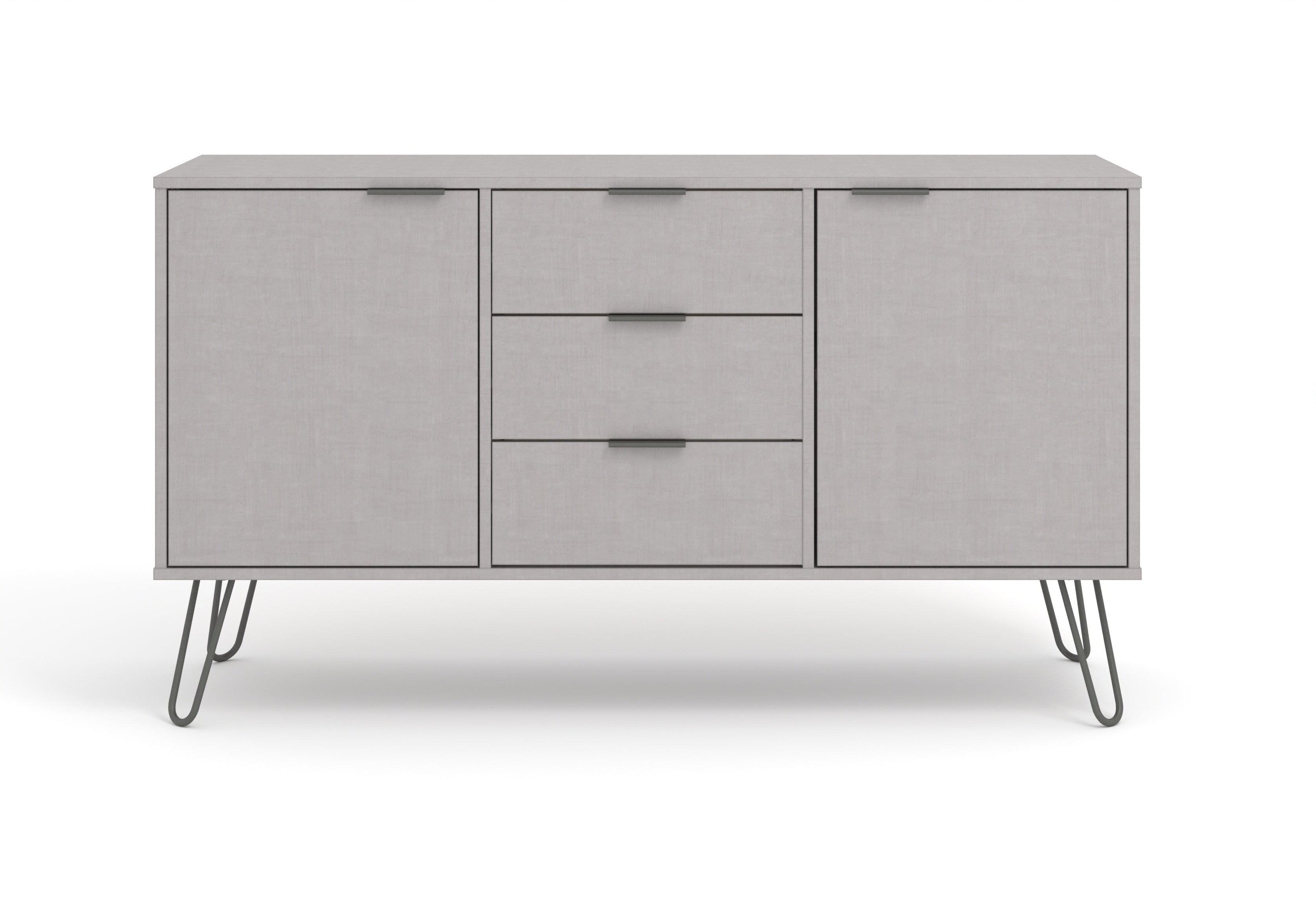 A great combination of drawer and cupboard space, our industrial styled medium sideboard is finished in an easy to clean grey textured melamine finish with plastic pull handles and metal feet. W130.6 x D43 x H73.6 cm