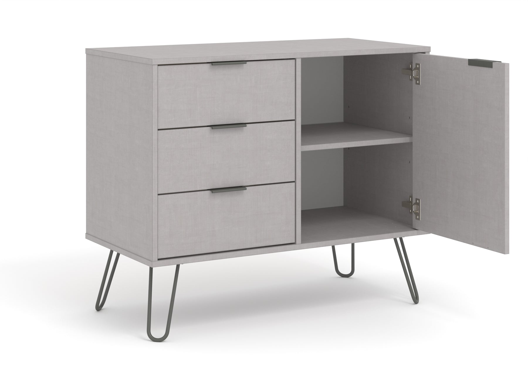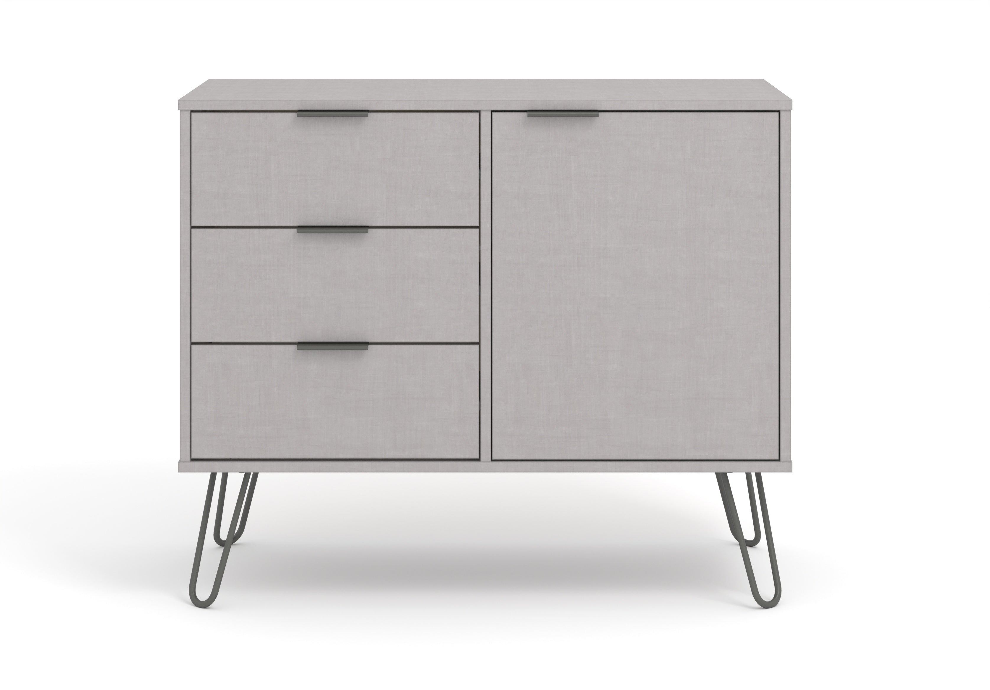 Our compact industrial styled small sideboard offers plenty of drawer and cupboard storage in an easy to clean, grey textured melamine finish with plastic pull handles and metal feet. W90 x D43 x H73.6 cm