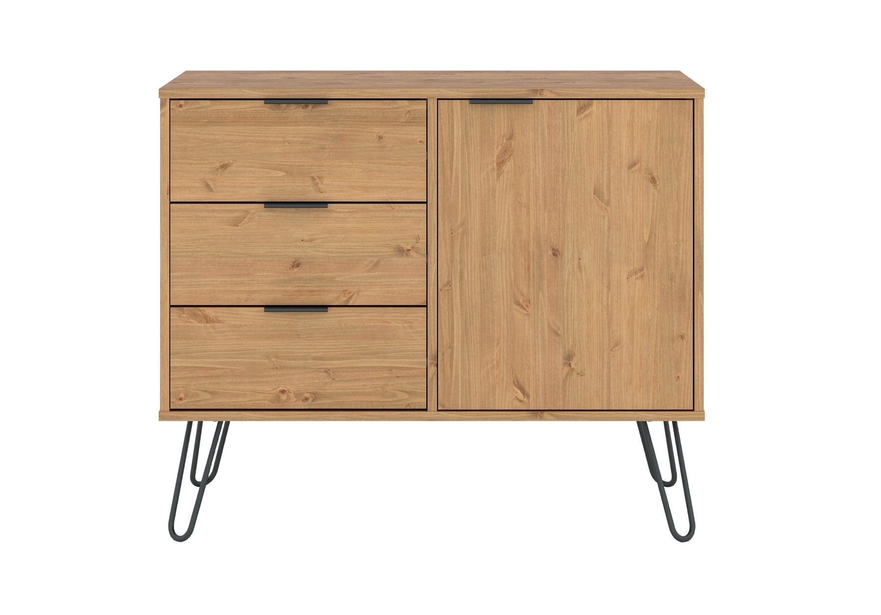Our compact industrial styled small sideboard offers plenty of drawer and cupboard storage in an attractive wax finish with real metal. W90 x D43 x H73.6 cm