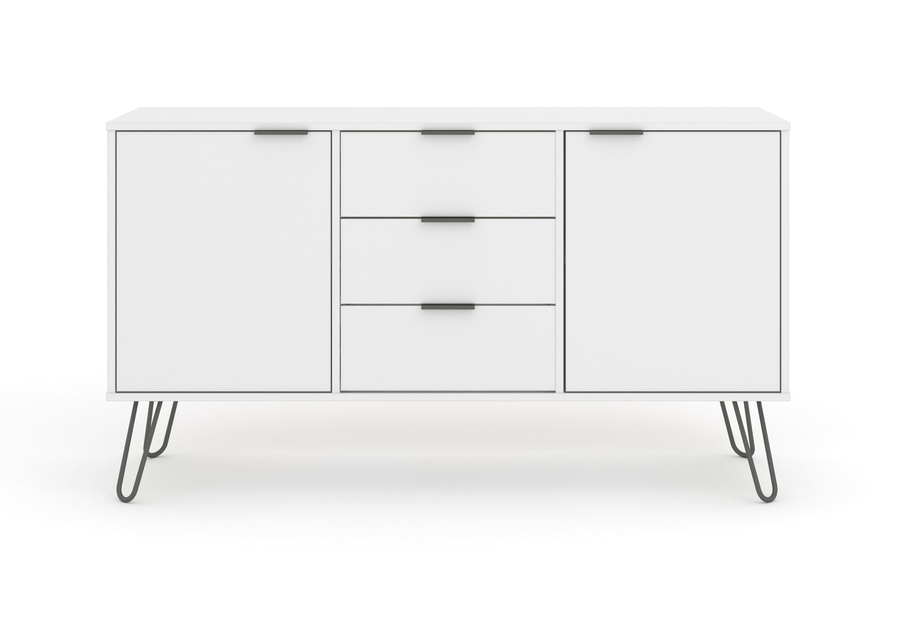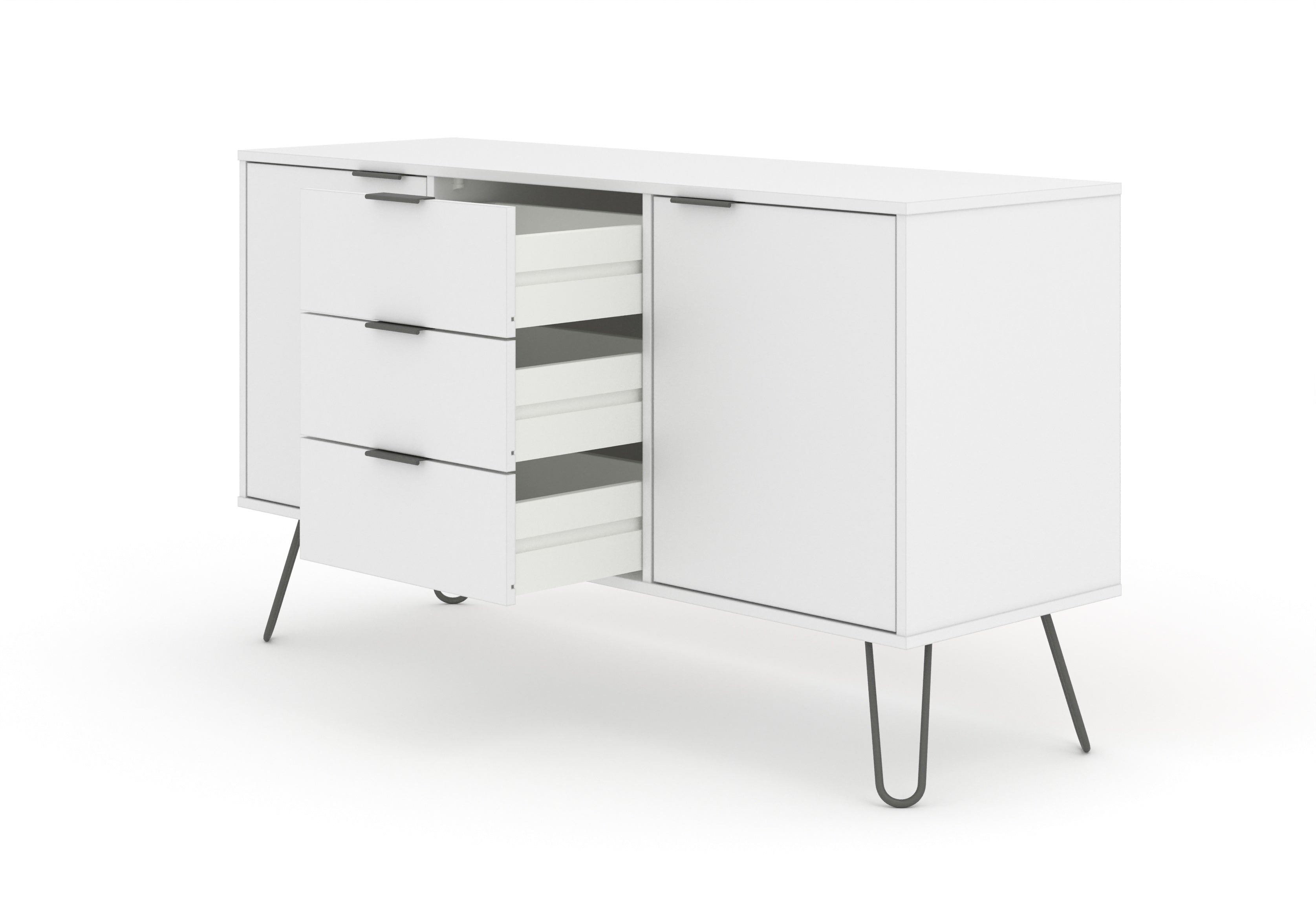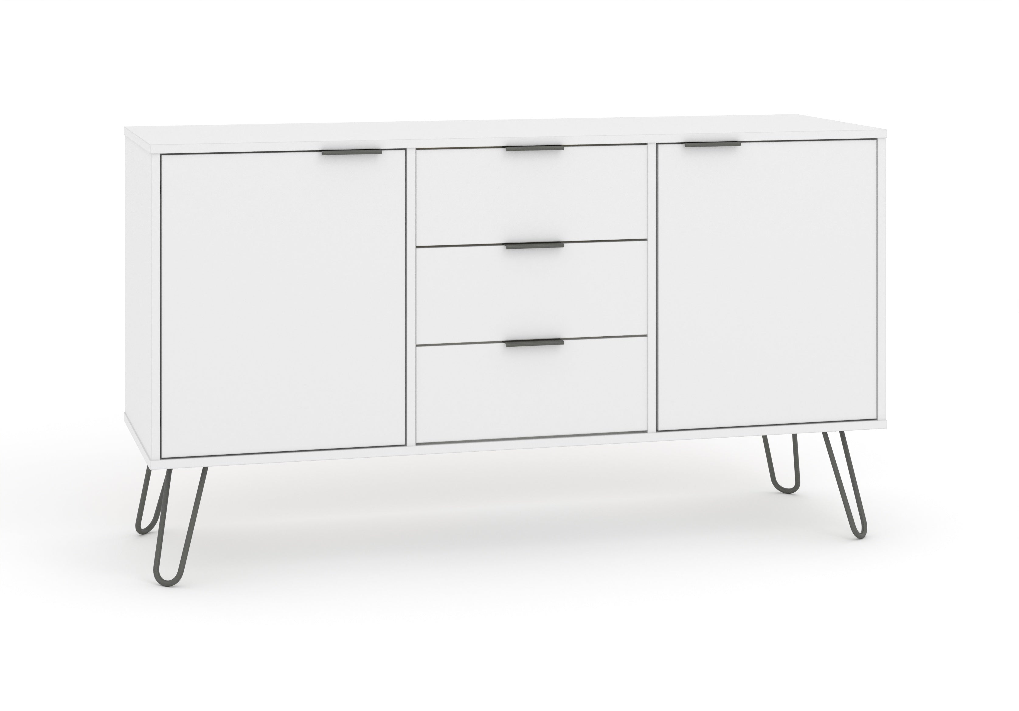 A great combination of drawer and cupboard space, our industrial styled medium sideboard is finished in an easy to clean crisp white textured melamine finish with plastic pull handles and metal feet. W130.6 x D43 x H73.6 cm