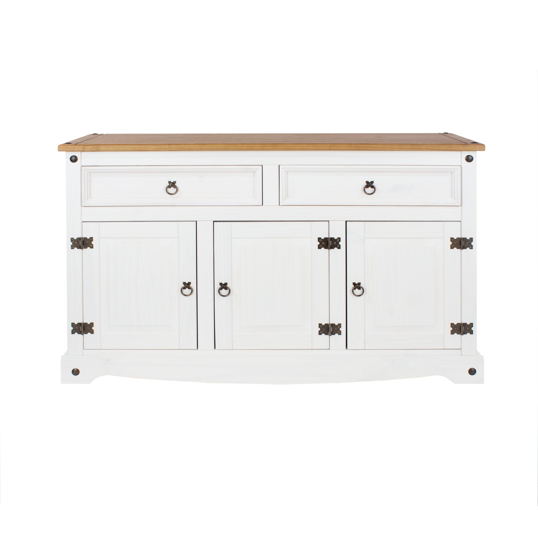 Our most popular sized sideboard, with 2 wide drawers and 3 cupboard doors behind which you will find an adjustable shelf, ample storage all in a beautiful white wax with antique wax finish top. W132 x D43 x H80.6 cm