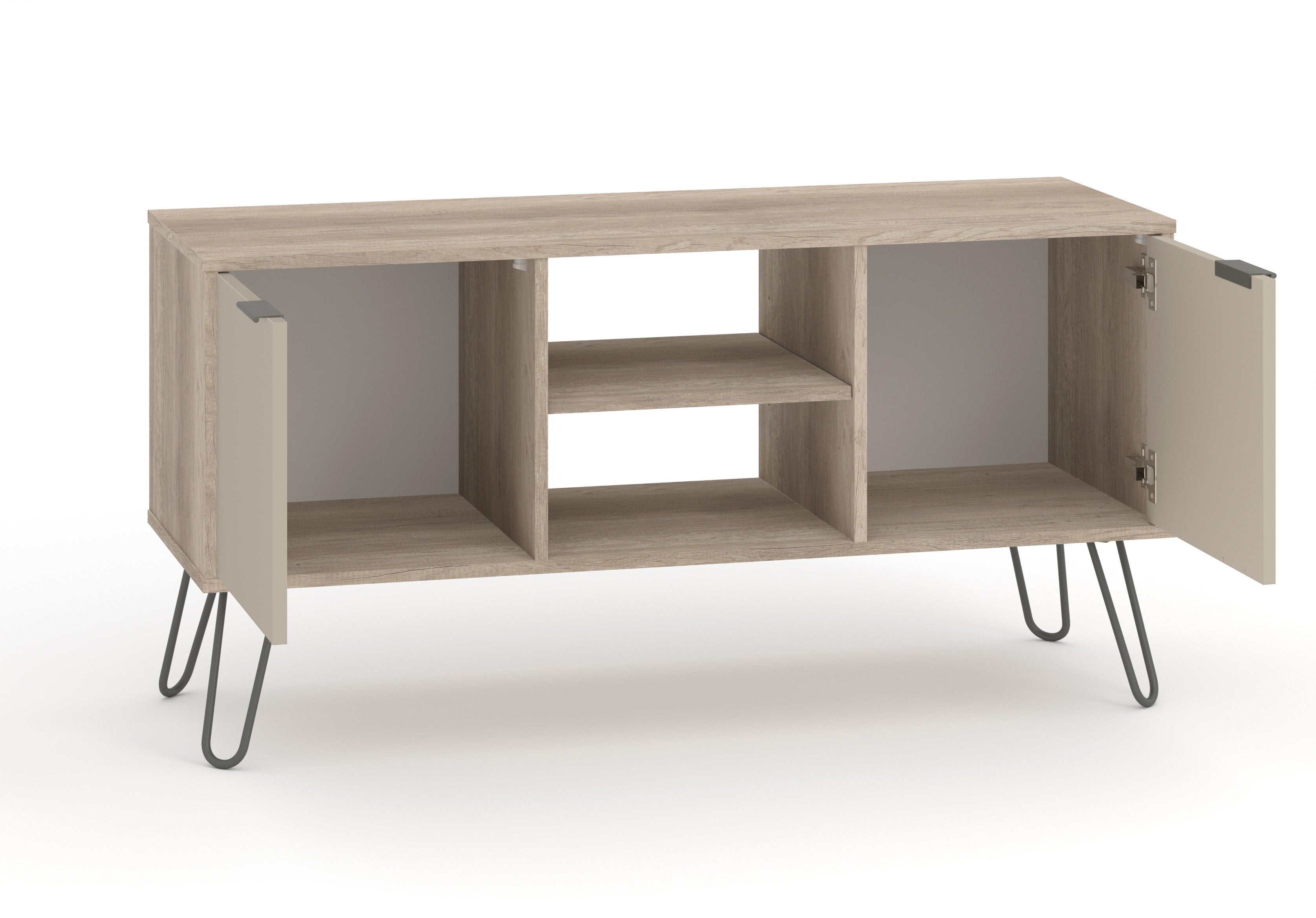 Industrial styling and functional, this TV unit features plenty of storage in a combination of driftwood and calico effect finishes in easy to clean melamine with plastic pull handles and metal feet. W114.5 x D39.5 x H57 cm