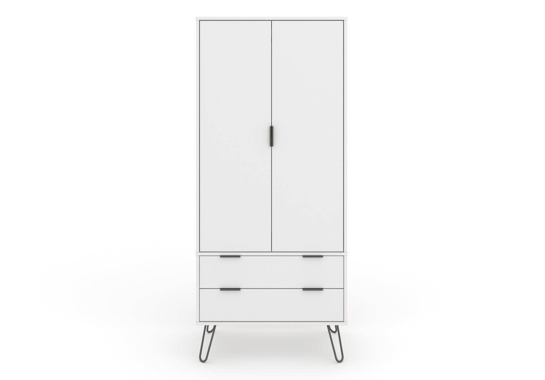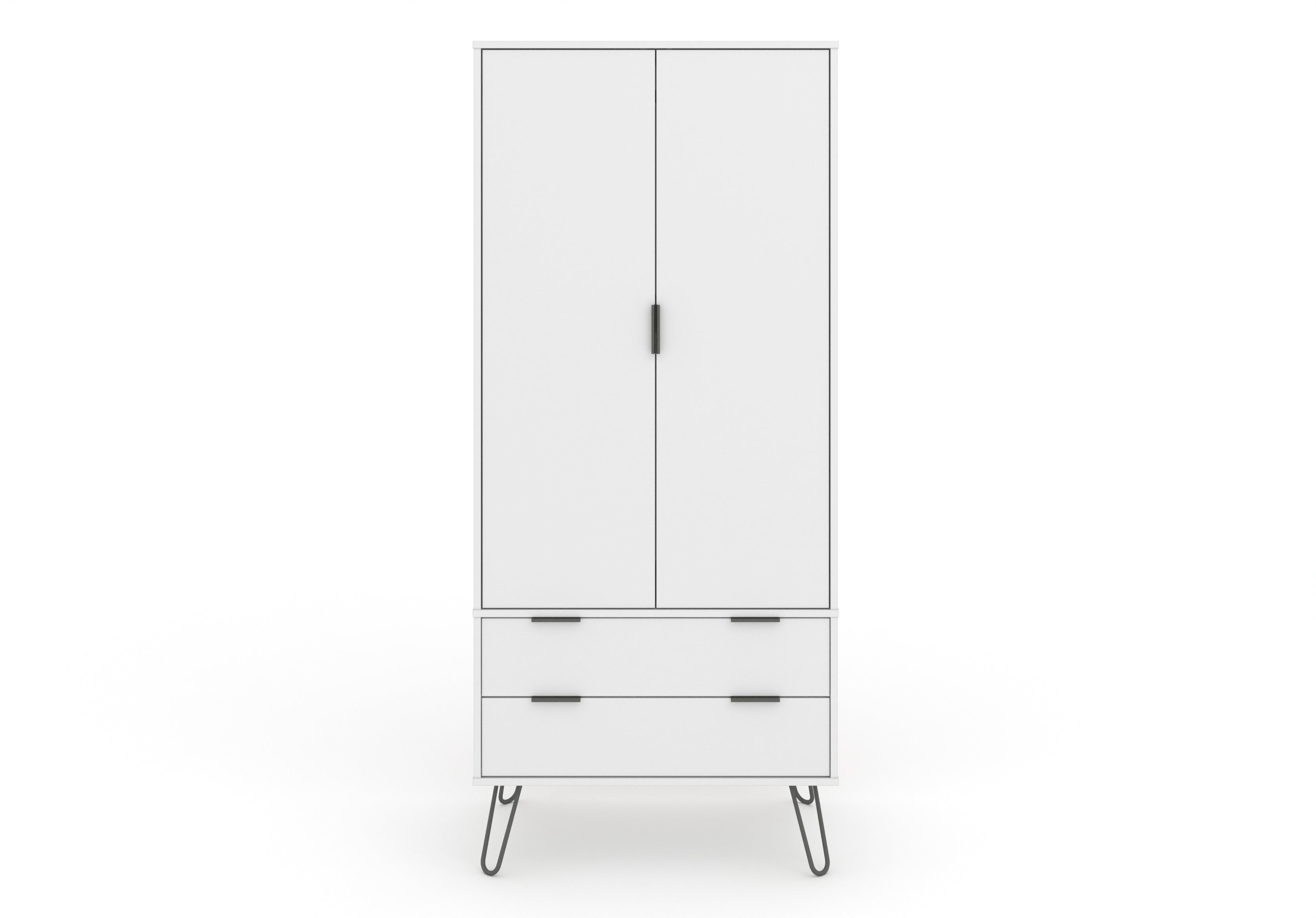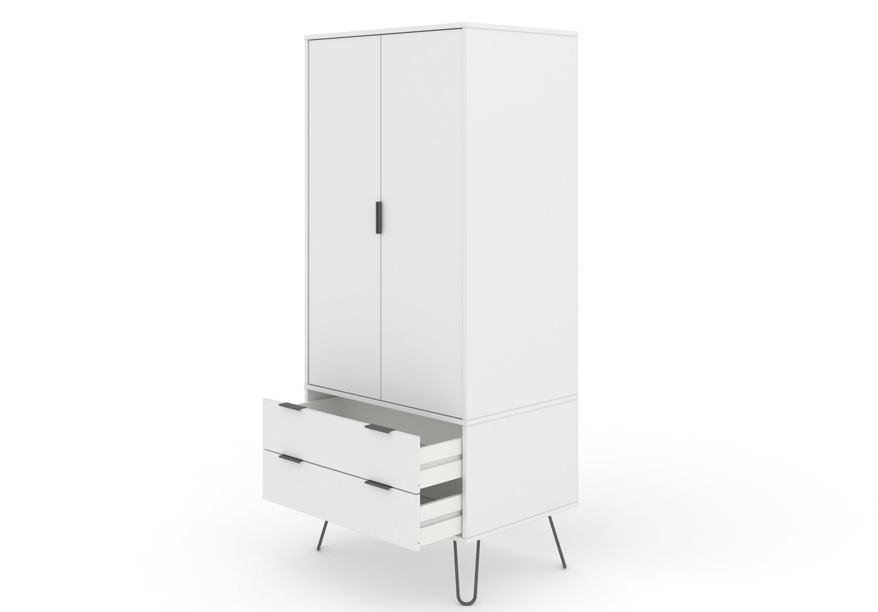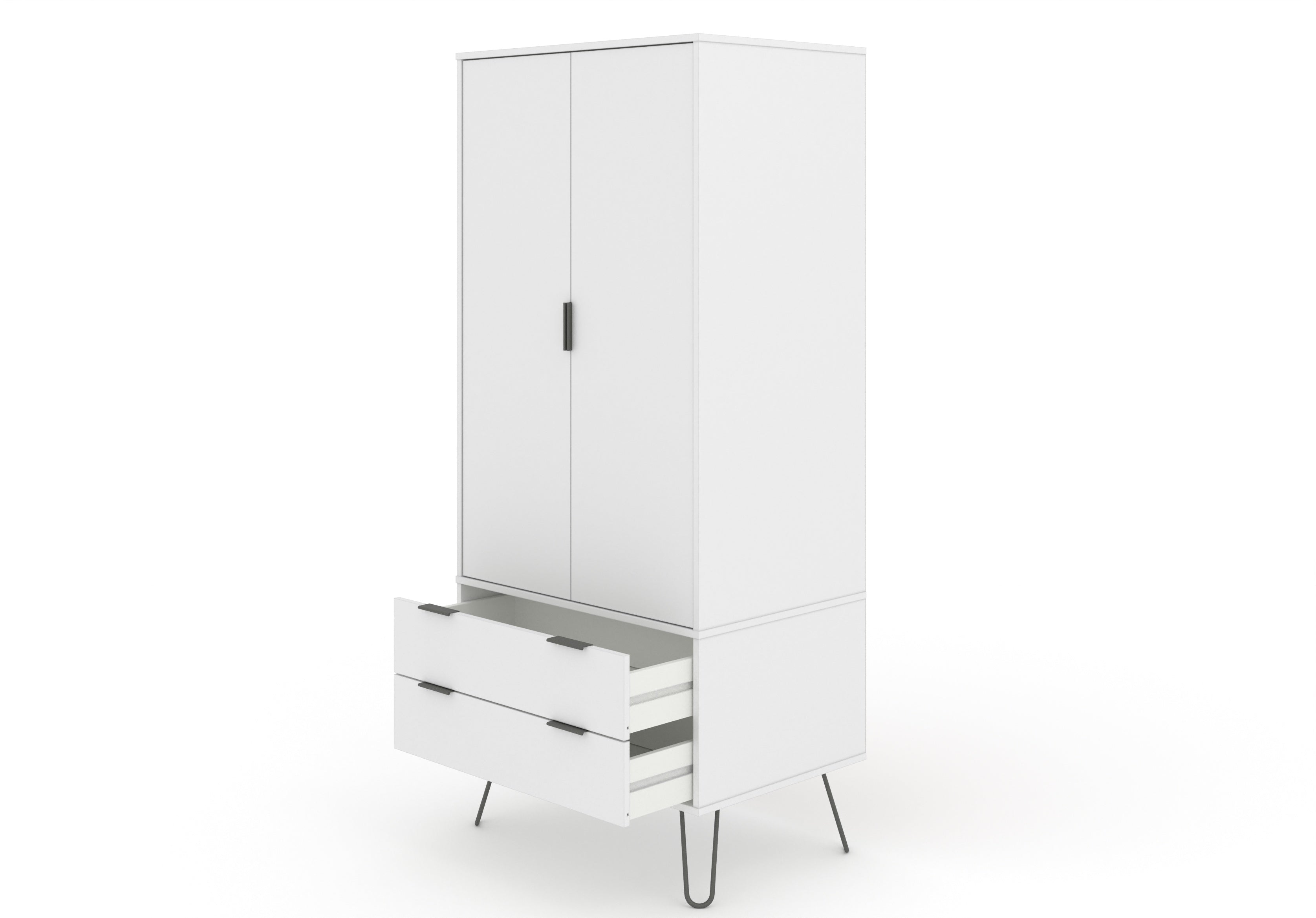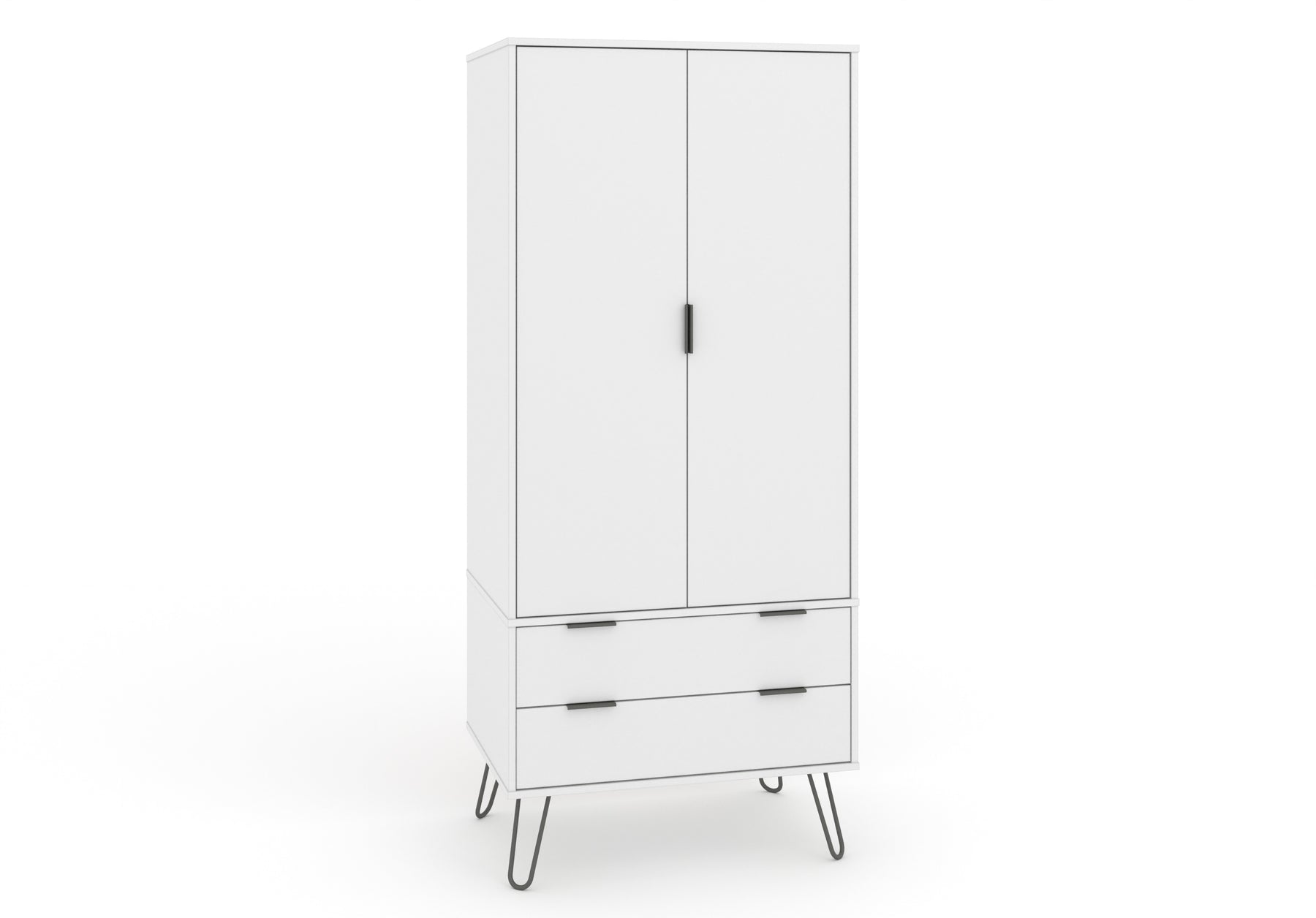 Compact and practical, this industrial look wardrobe offers plenty of drawer space along with a generous hanging space, all finished in an easy to clean, crisp white textured melamine finish with plastic pull handles and metal feet. W76.5 x D53 x H176 cm