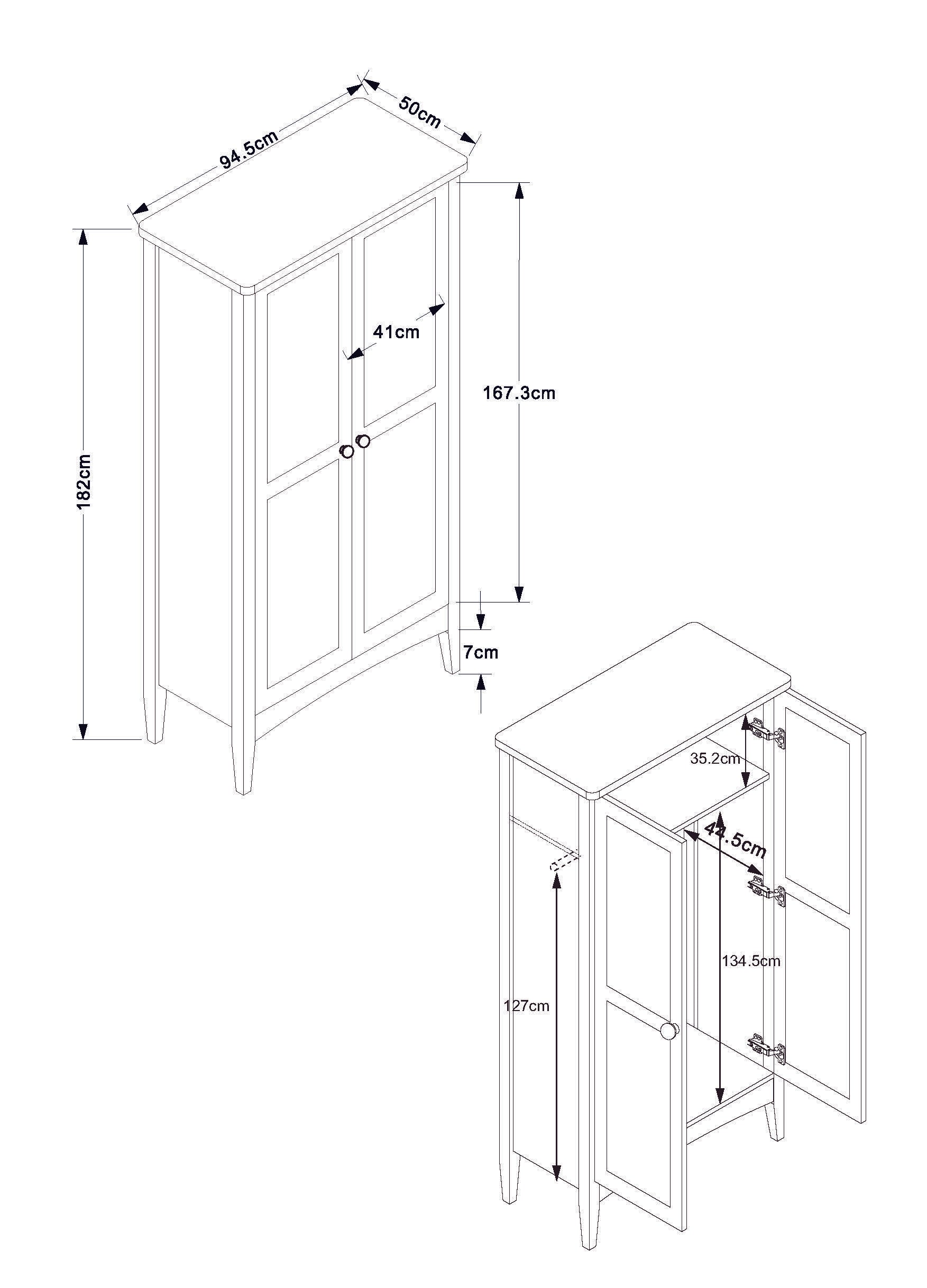 This 2 door wardrobe offers ample storage with fitted shelf, metal hanging rail and adjustable hinges, all finished in a soft grey paint finish with real metal handles. W94.5 x D52 x H182 cm
