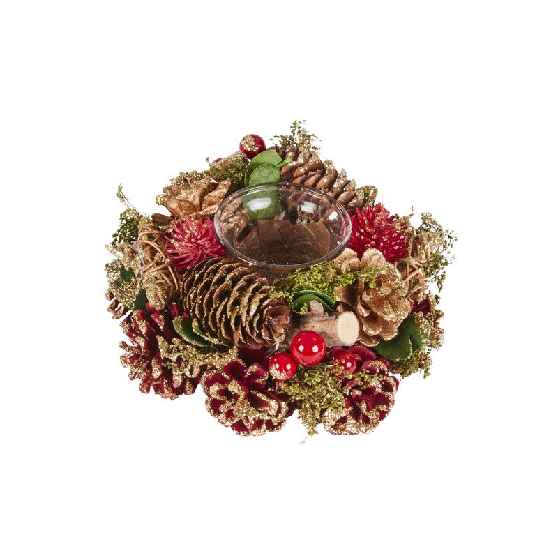 - Festive, rustic candle holder complete with winter berries and pinecones
