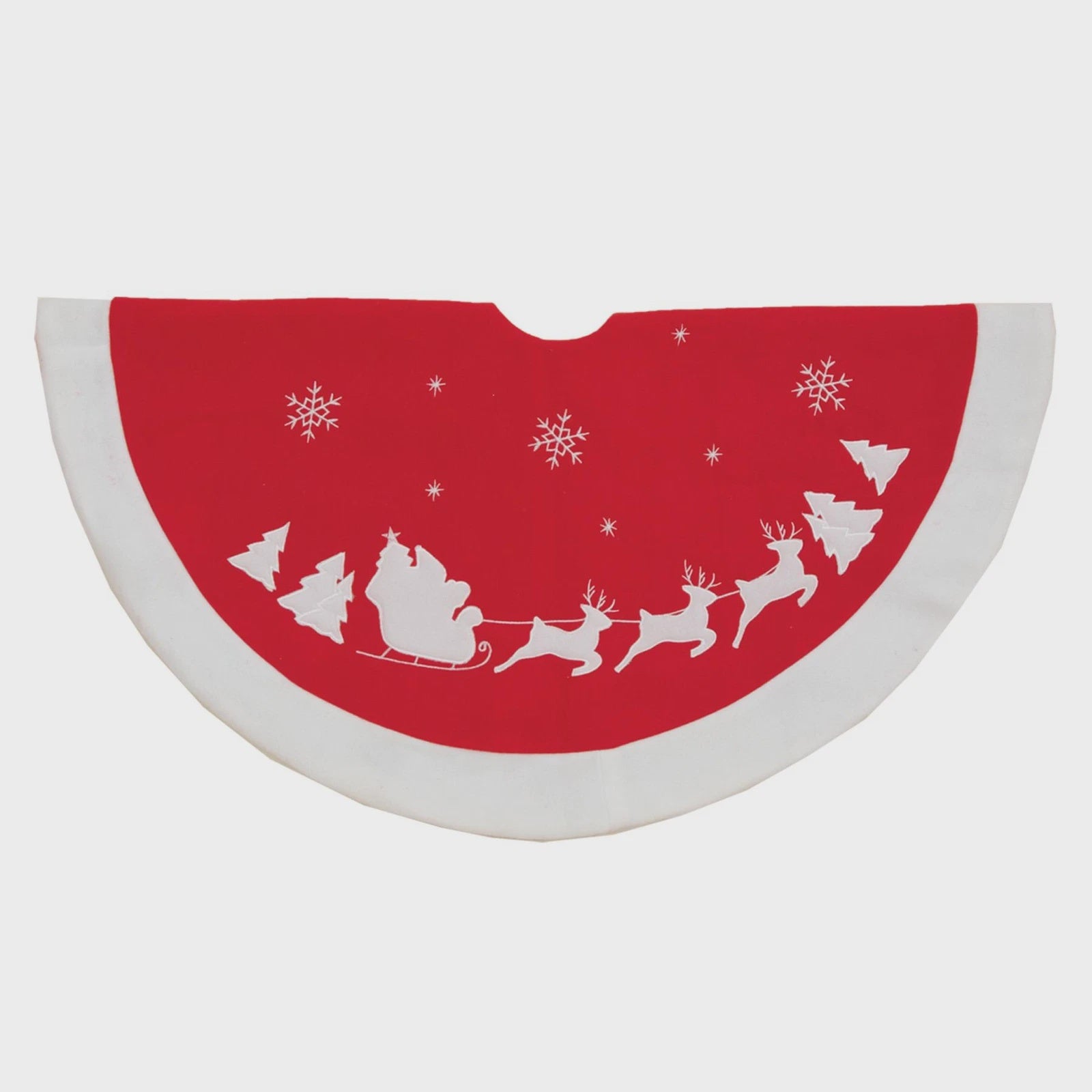- Designed with attention to detail, the front of the tree skirt showcases an exquisite embroidered Santa Sleigh design, accompanied by delicate snowflakes.