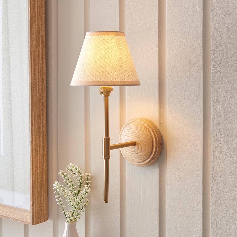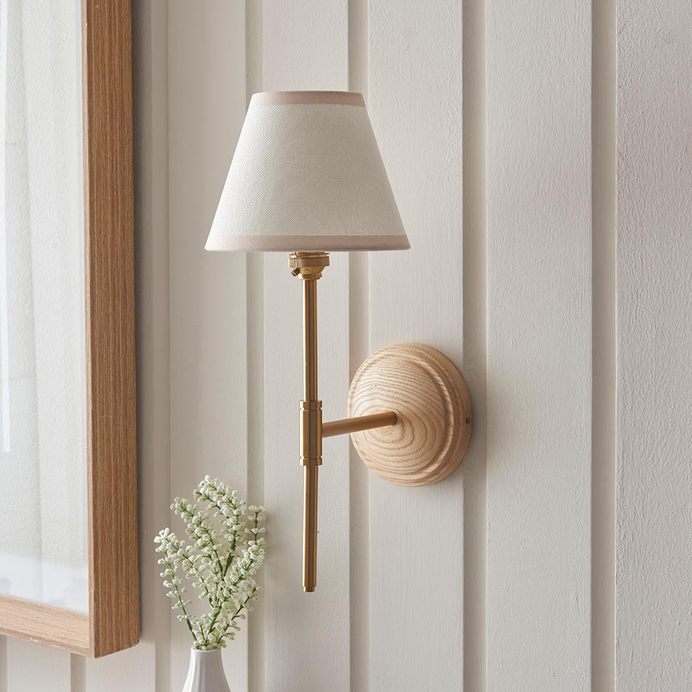 A natural Ash wood wall back with understated T shape arm. Perfect for many areas of your home, finished in brushed aged brass; paired with our vintage & almond white 16cm Ivy shade.